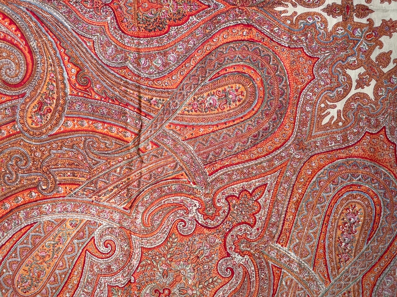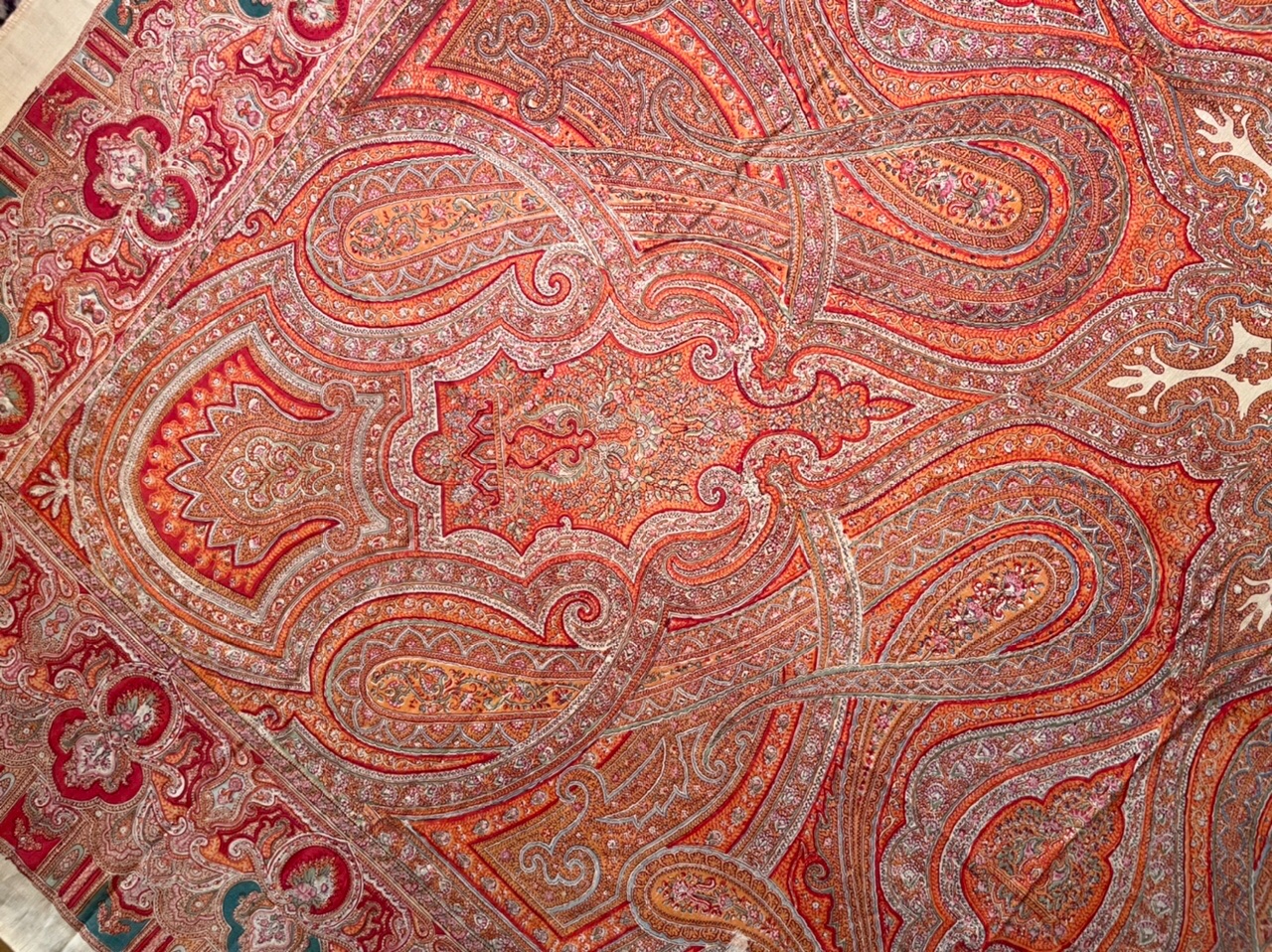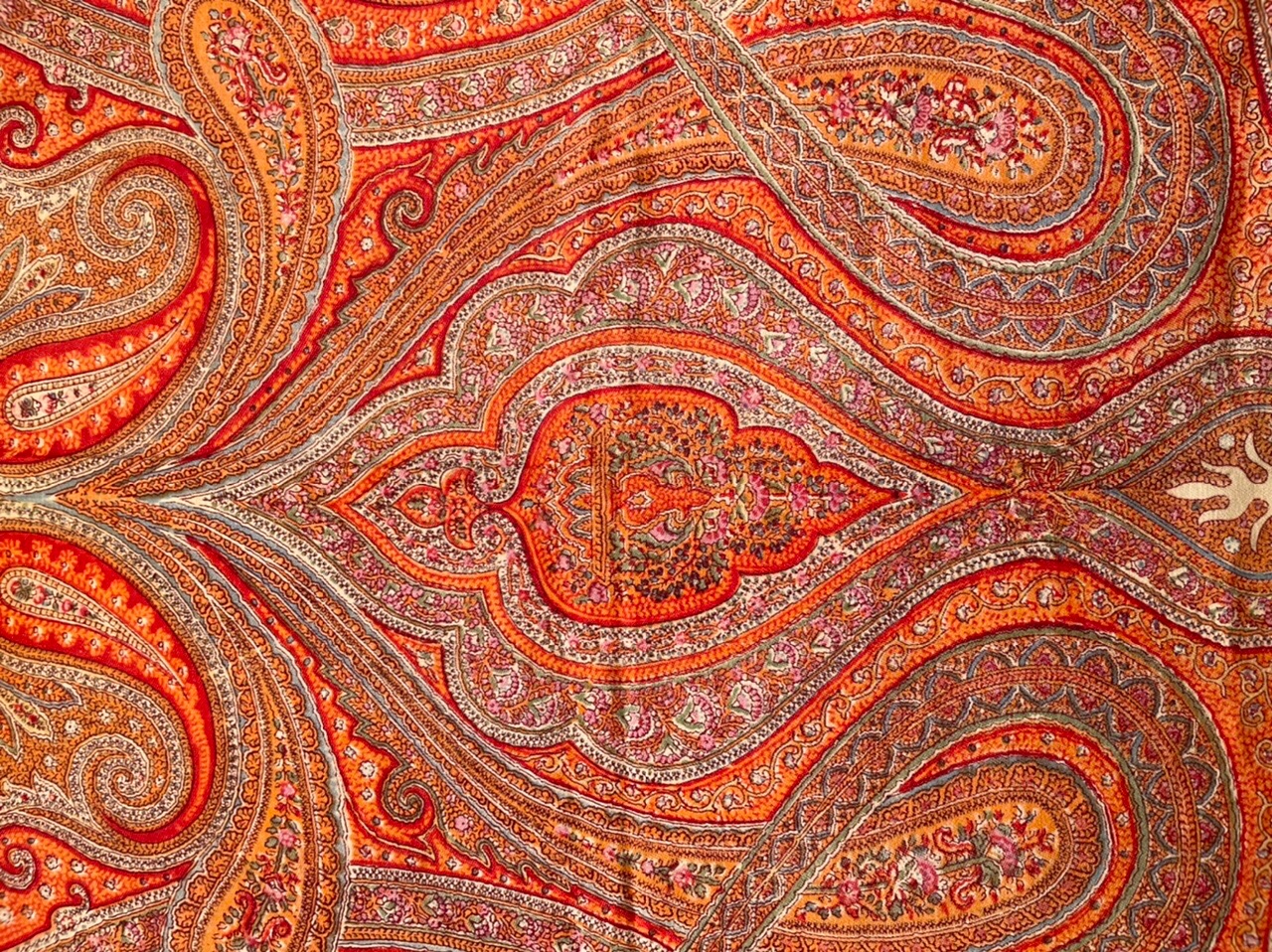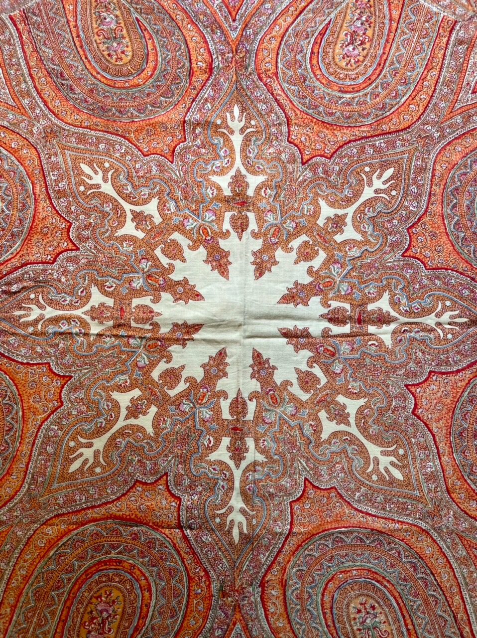 Шаль оранжево-красная, оригинальный орнаментальный рисунок с угловыми опахалами и сложными переплетенными элементами, которые заполнены мелкими цветочными гирляндами. Рисунок собран вокруг звёздчатого средника цвета слоновой кости. Кайма с богатым орнаментом. Все пространство плотно заполнено «филигранью»
