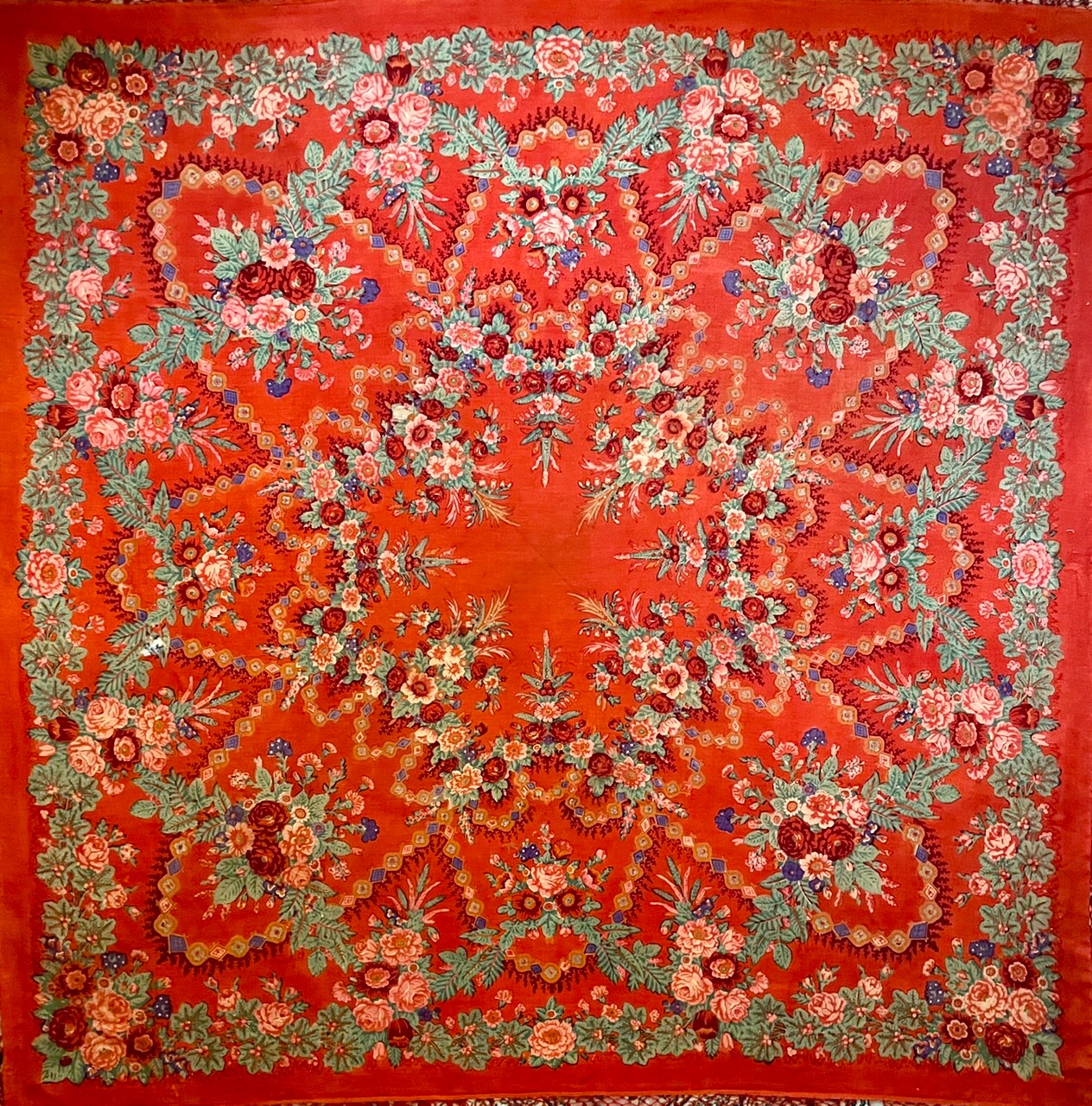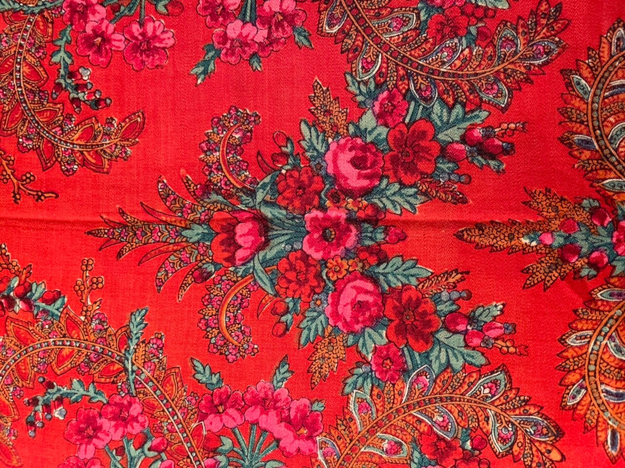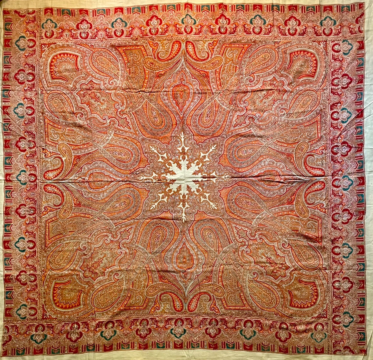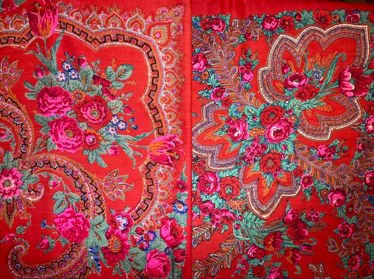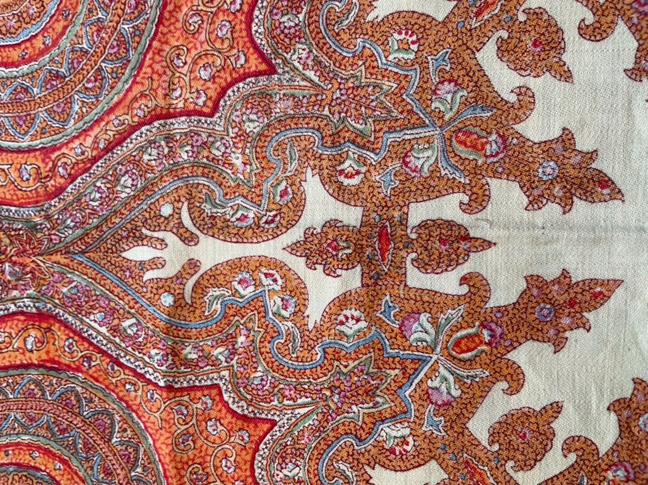Старинная орнаментальная шаль второй половины 19 в., 178х178, ручная набойка, смесовая ткань (хлопчатобумажная основа, шерстяной уток), без бахромы. Клеймо «Фабрики братьев Штефко». Исходя из истории мануфактуры и клейма, период производства относится к промежутку 1862-1880 гг