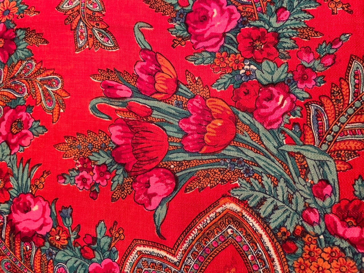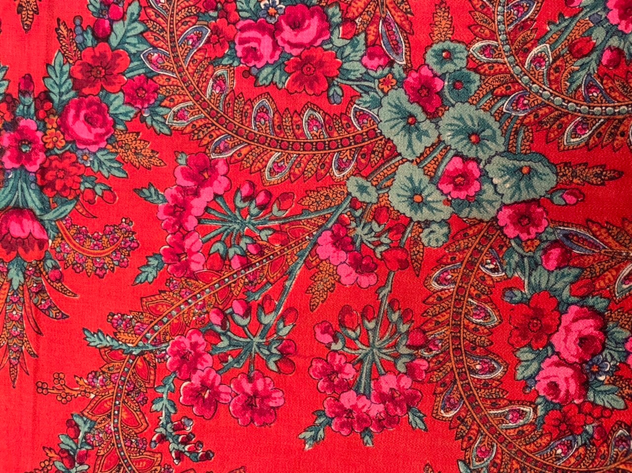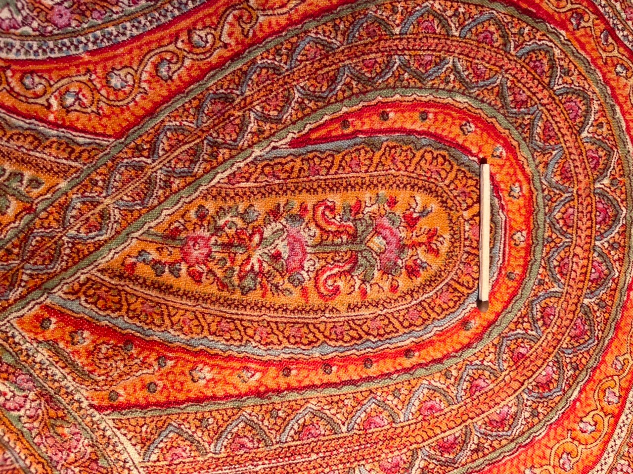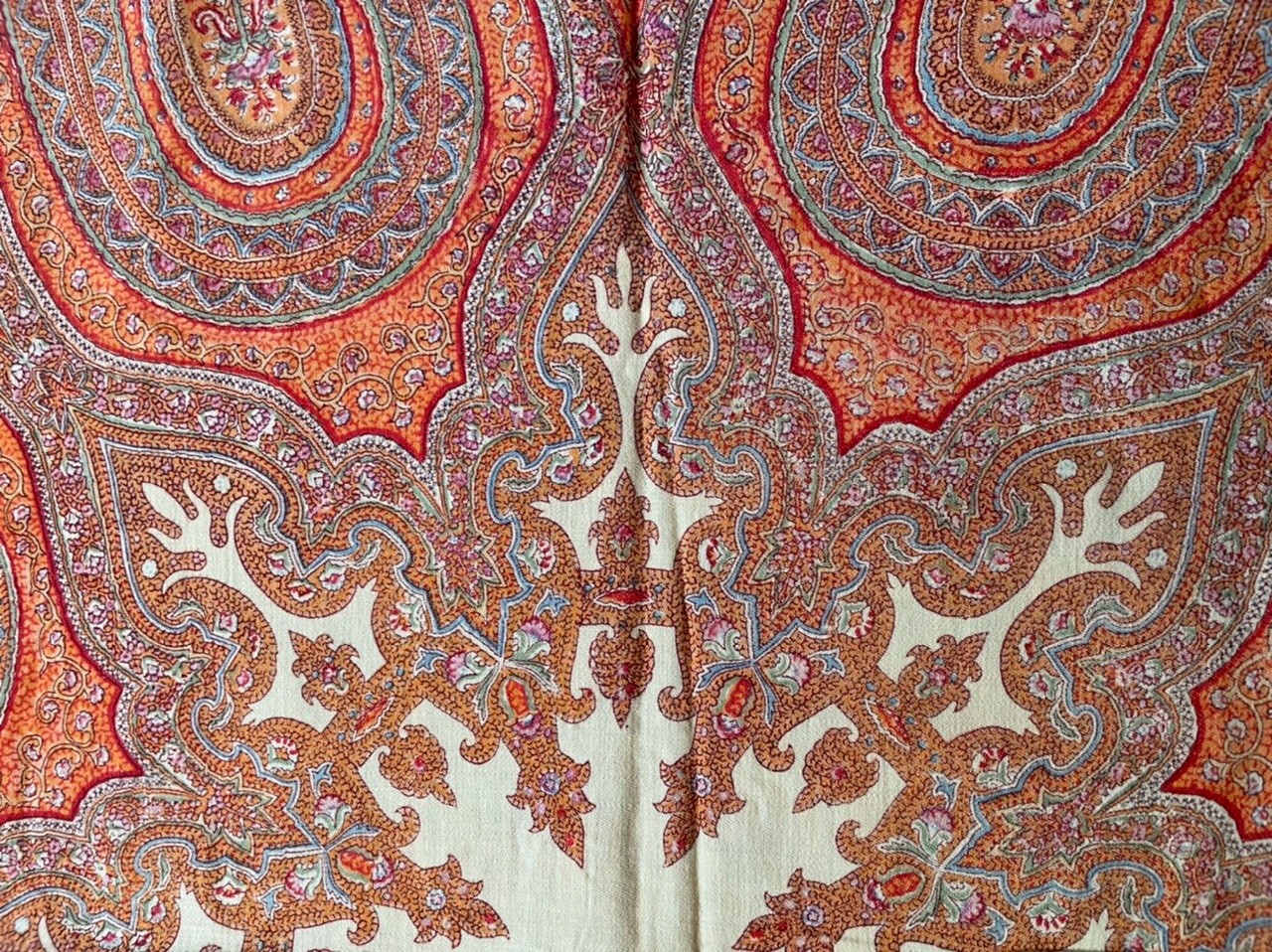 Старинная орнаментальная шаль второй половины 19 в., 178х178, ручная набойка, смесовая ткань (хлопчатобумажная основа, шерстяной уток), без бахромы. Клеймо «Фабрики братьев Штефко». Исходя из истории мануфактуры и клейма, период производства относится к промежутку 1862-1880 гг