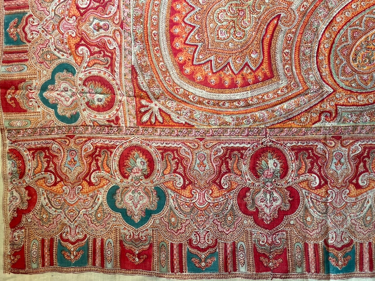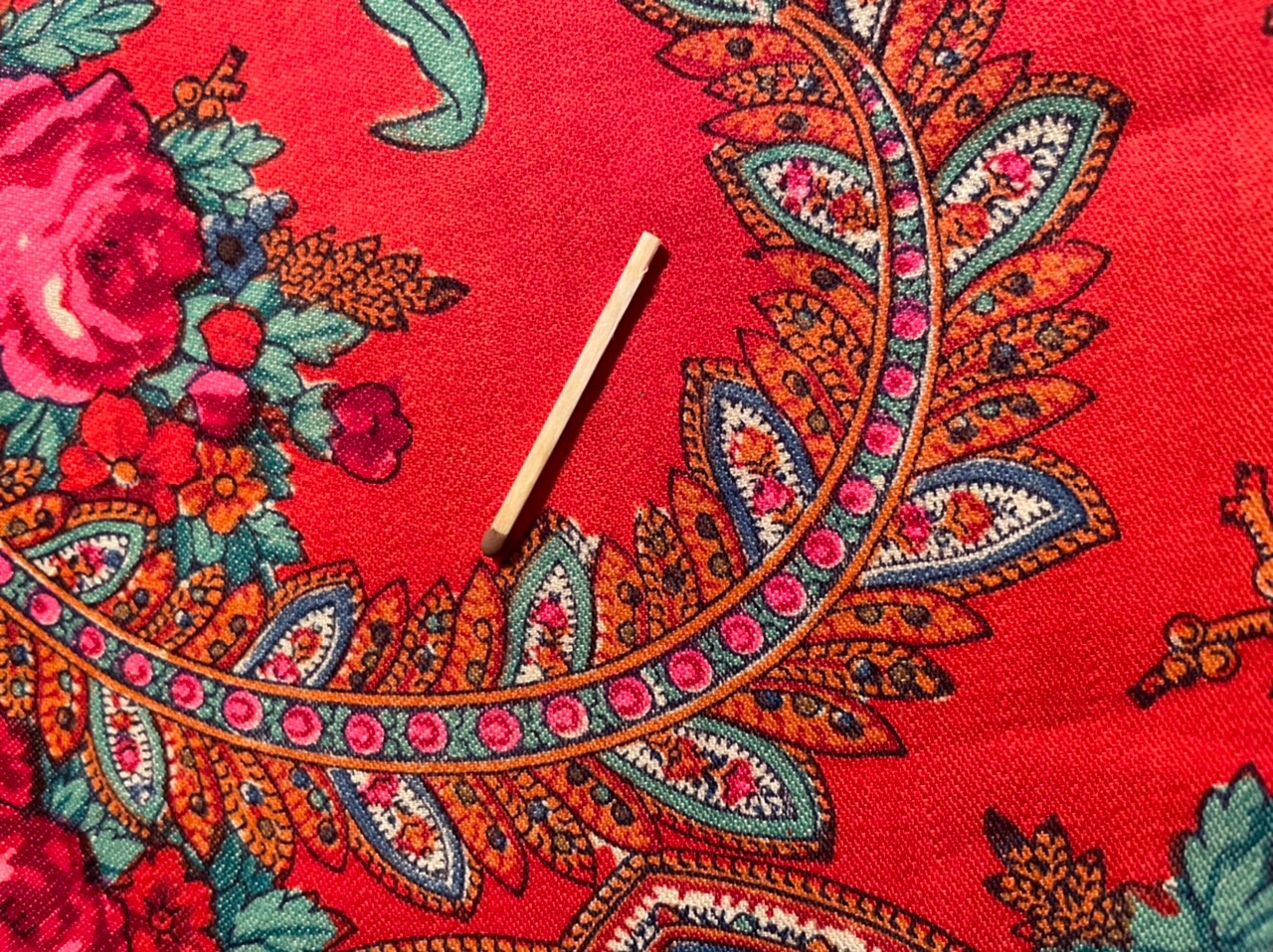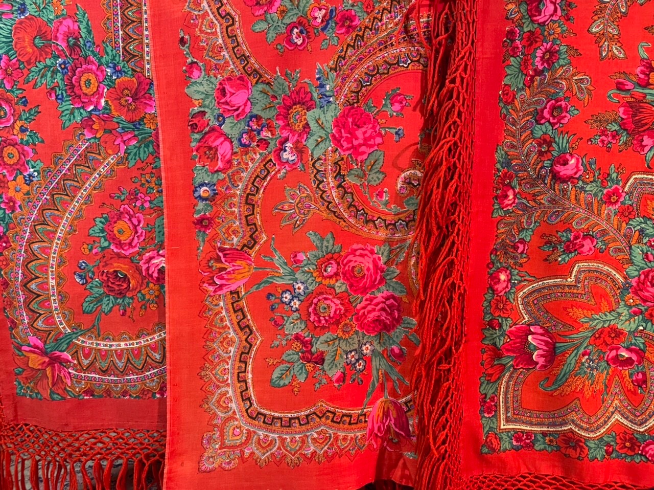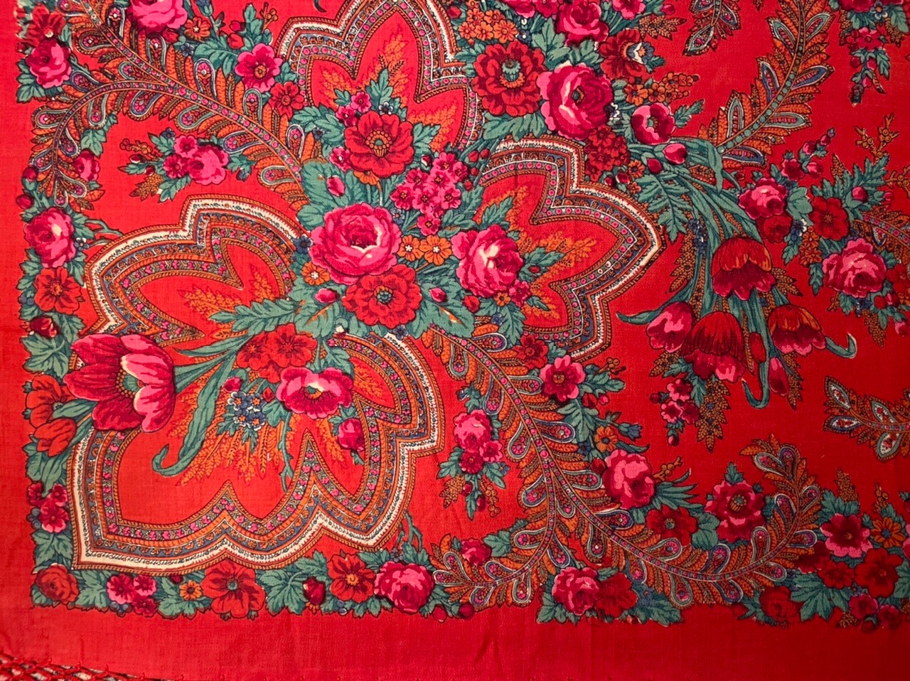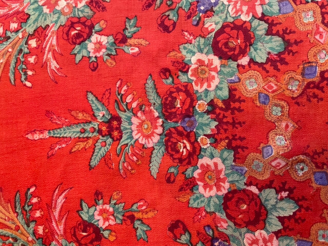 Старинная орнаментальная шаль второй половины 19 в., 178х178, ручная набойка, смесовая ткань (хлопчатобумажная основа, шерстяной уток), без бахромы. Клеймо «Фабрики братьев Штефко». Исходя из истории мануфактуры и клейма, период производства относится к промежутку 1862-1880 гг