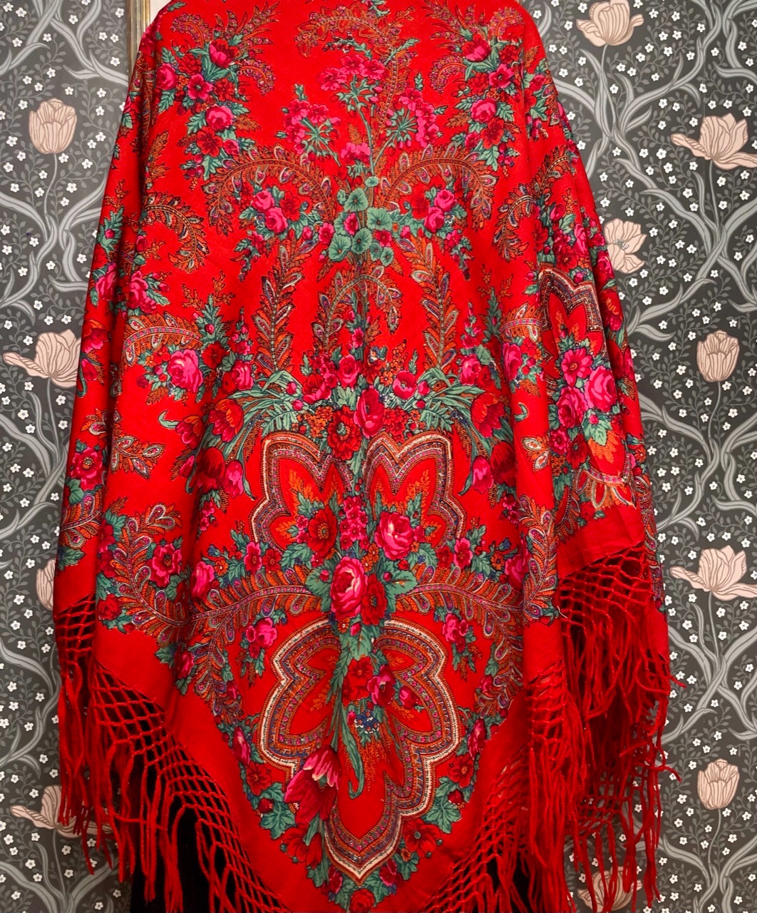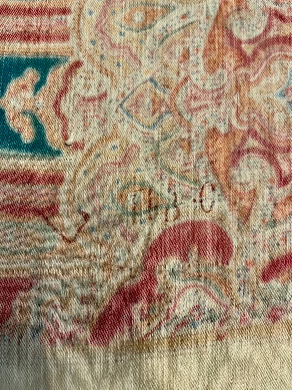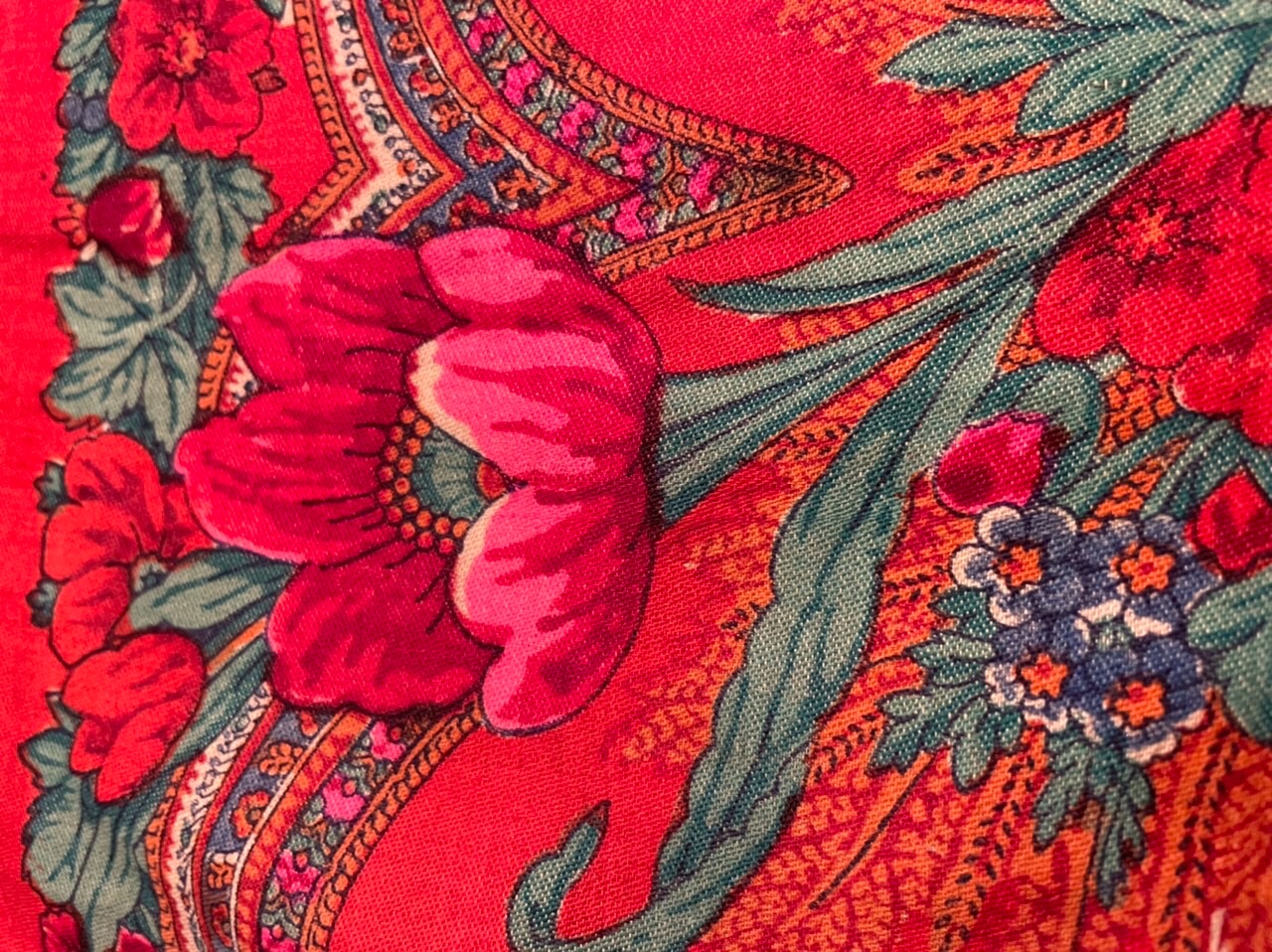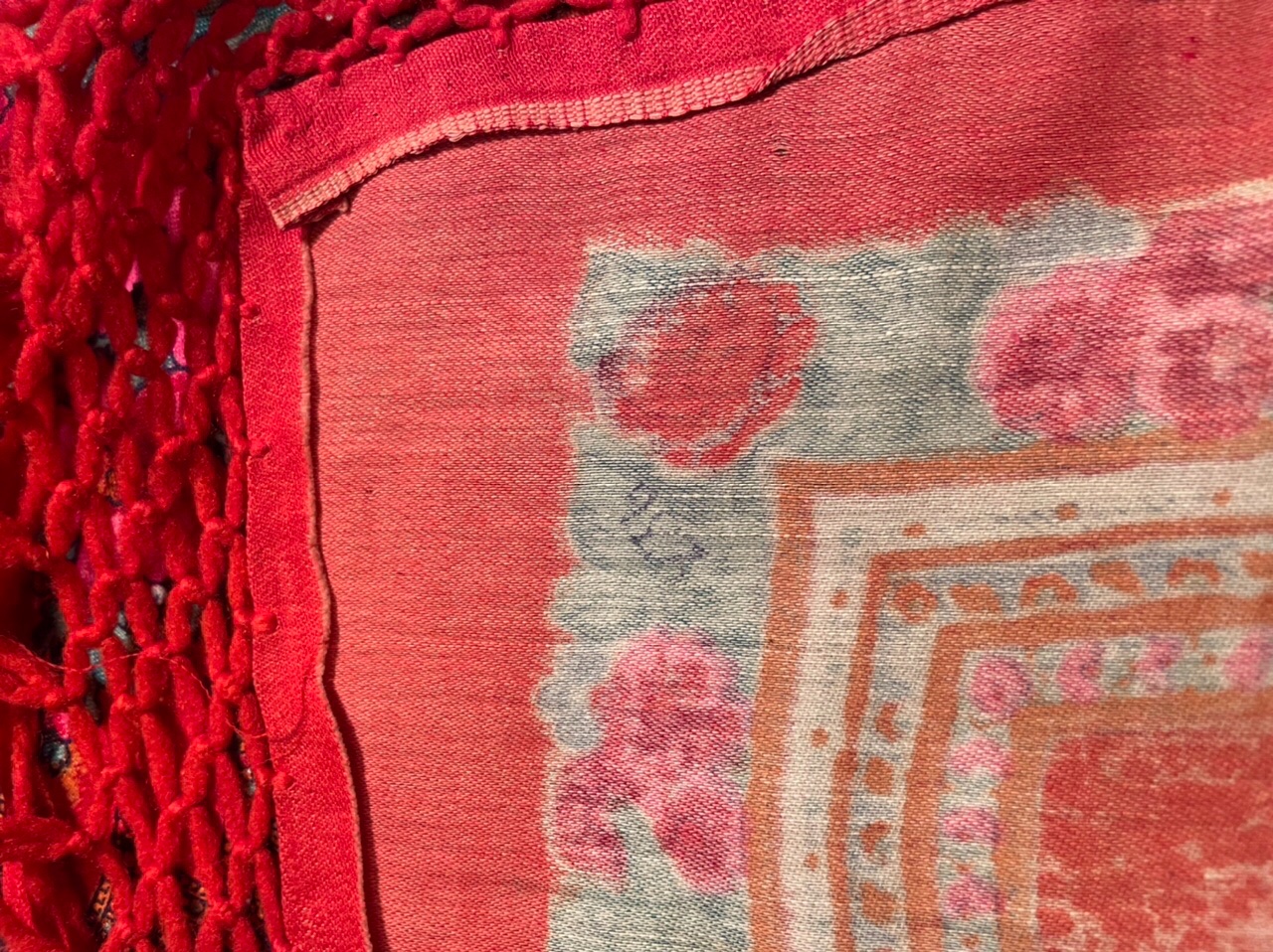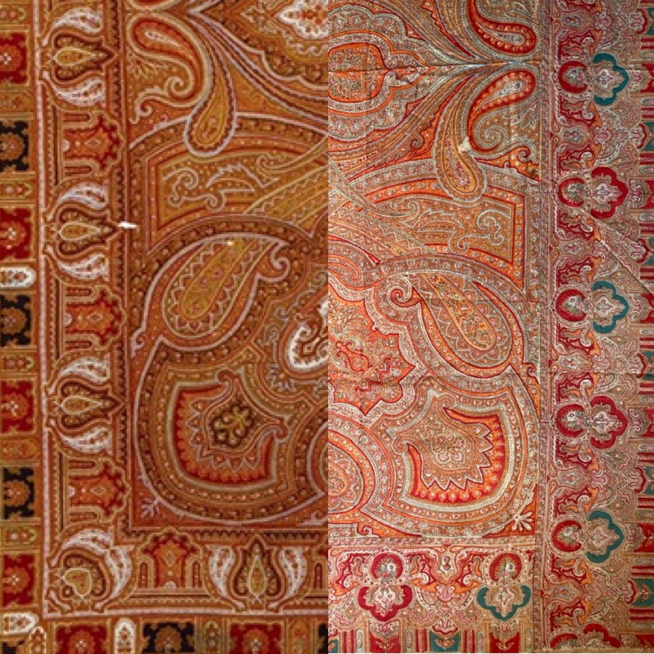 Старинная орнаментальная шаль второй половины 19 в., 178х178, ручная набойка, смесовая ткань (хлопчатобумажная основа, шерстяной уток), без бахромы. Клеймо «Фабрики братьев Штефко». Исходя из истории мануфактуры и клейма, период производства относится к промежутку 1862-1880 гг