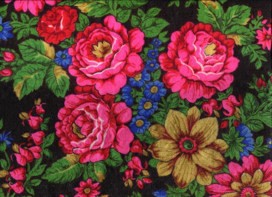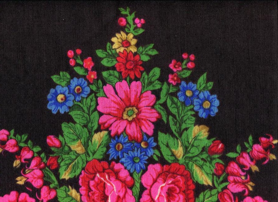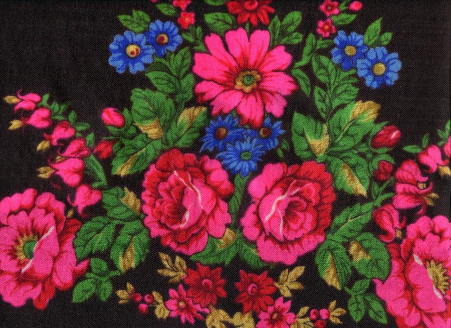 Как трудно бывает отойти от стереотипа. Долгое время между собою мы считали этот платок украинским, и вот теперь Ирина Петровна его опознала как шаль по рисунку Ольшевской! А посмотрите крок их детской художественной школы и сравните с узором шали Елены. Как же они похожи - по отдельным цветочным элементам, манере изображения крупных цветов! Вобщем, мой стереотип рухнул! А как аккуратно напечатана шаль - чудо!