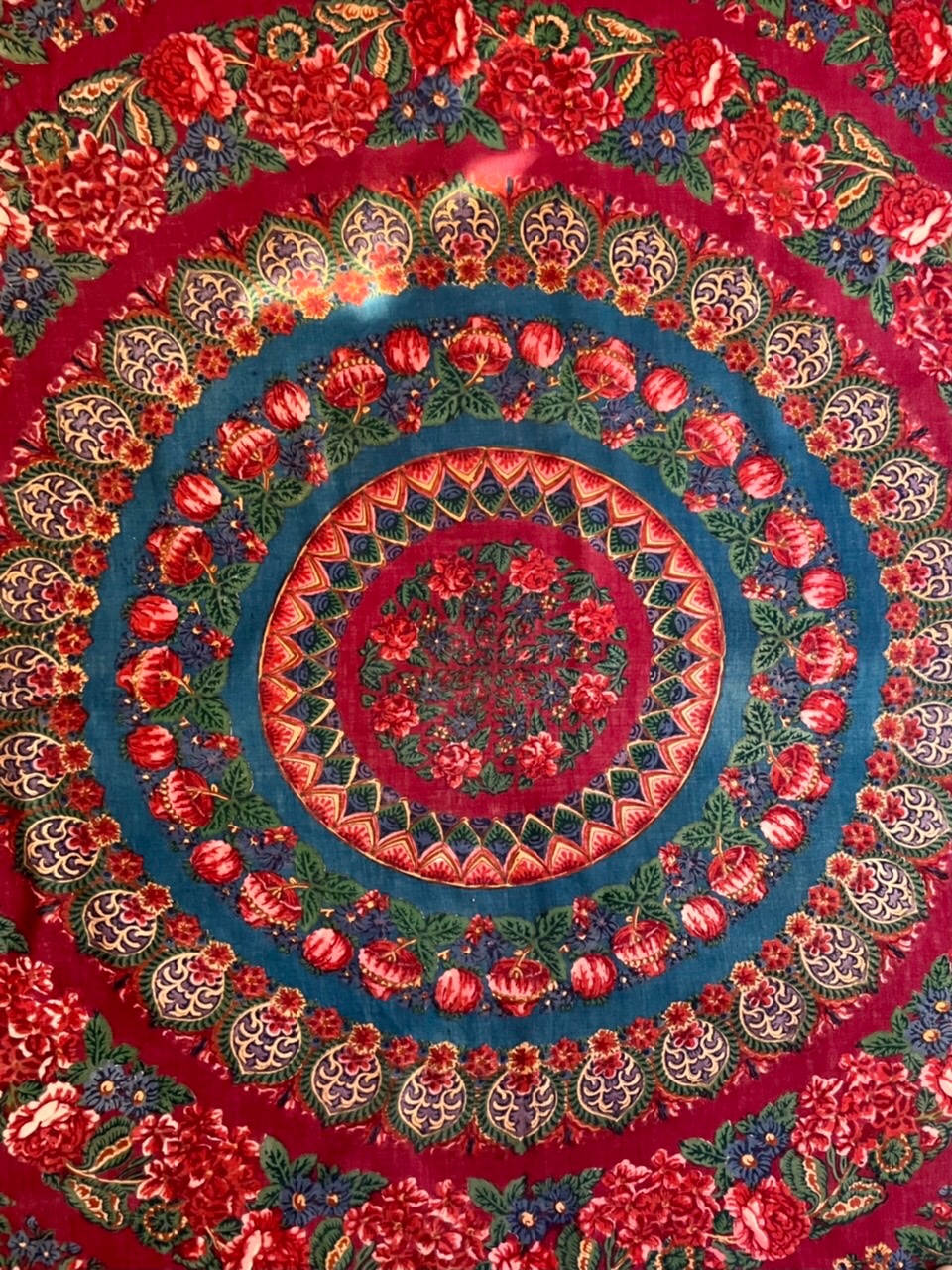 В моей коллекции круговая шаль первая. Производитель и время создания не определены. Я её пока изучаю, но ритм рисунка завораживает.