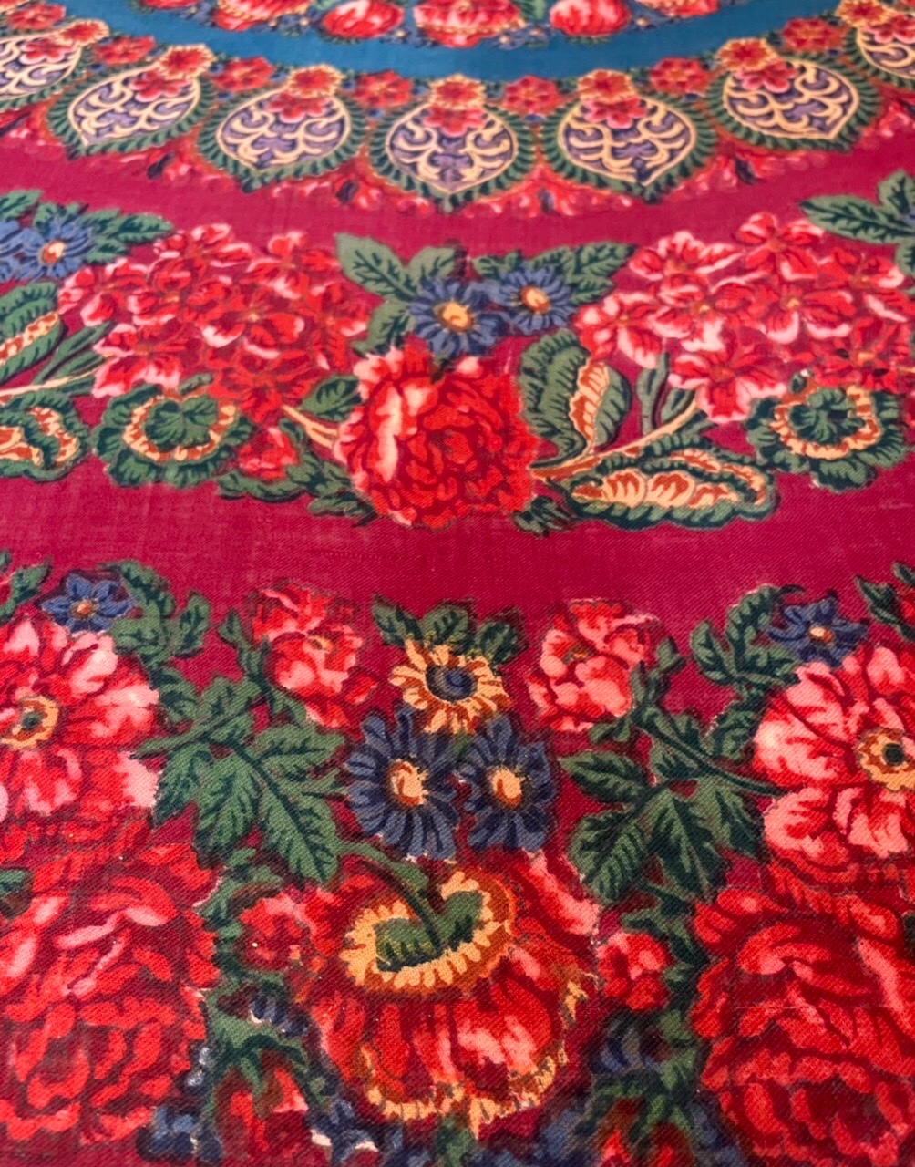 Шаль в прекрасной сохранности, ткань тонкая и пластичная, бахрома толстая. Клейма нет, поэтому производитель не определён. По сведениям продавца, шаль из Нижнего Новгорода. Прадед работал на Нижегородской ярмарке и приобрёл её там. Я предполагала, что шаль могла быть создана в 30-е годы, но, исходя из сведений о её бытовании, можно предположить о более раннем производстве. Качество набойки таково, что мастер, которая вязала бахрому, перепутала лицевую сторону с изнанкой и сделала одинарный подгиб на лицо, а потом навязала бахрому. Сначала я хотела перевязать эти две стороны, но теперь думаю оставить, как пример ошибки