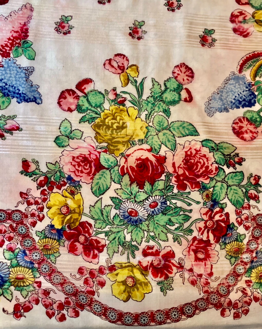 На последнем фото - этот же угол платка с изнанки. В области листочков букетика - остатки клейма.