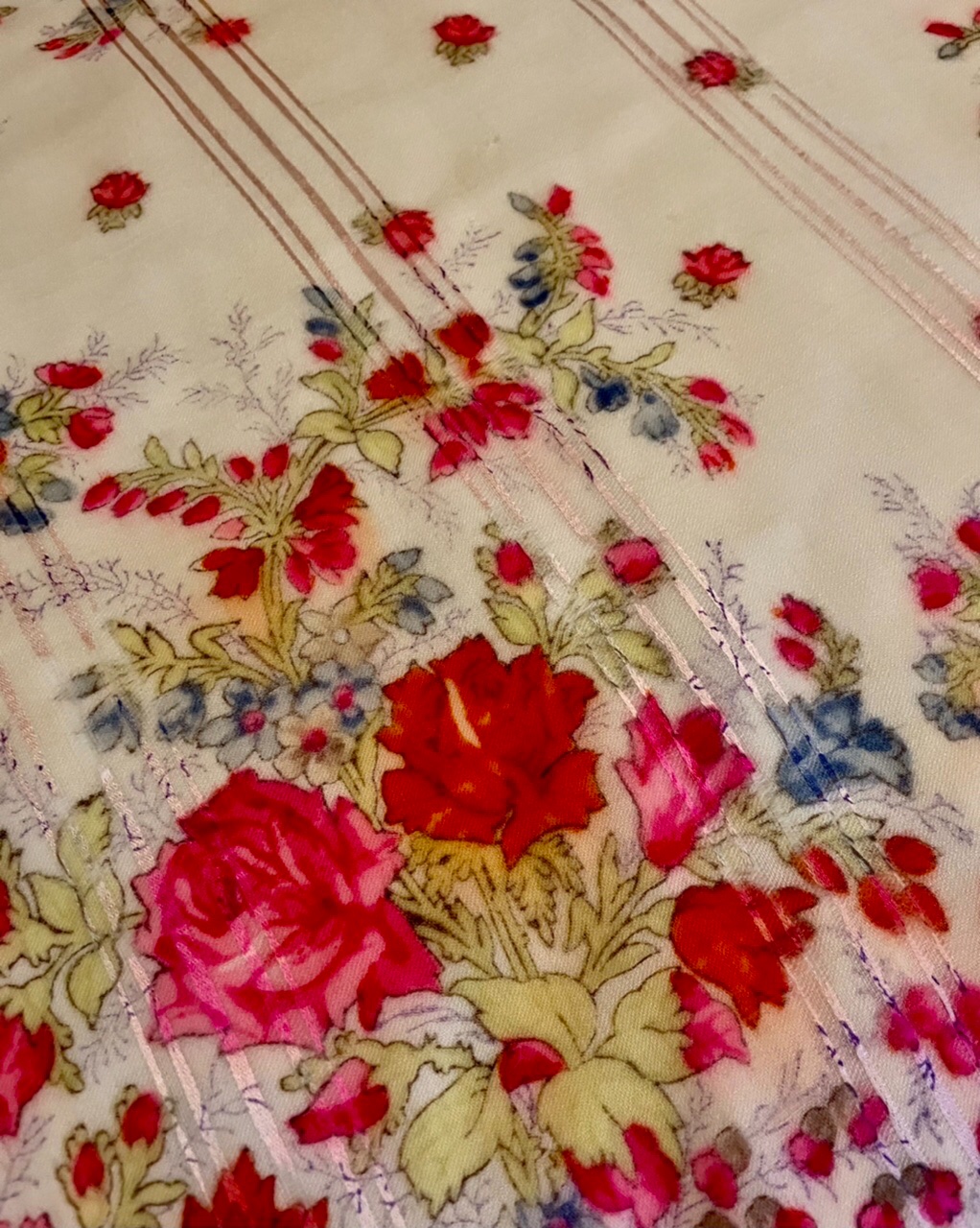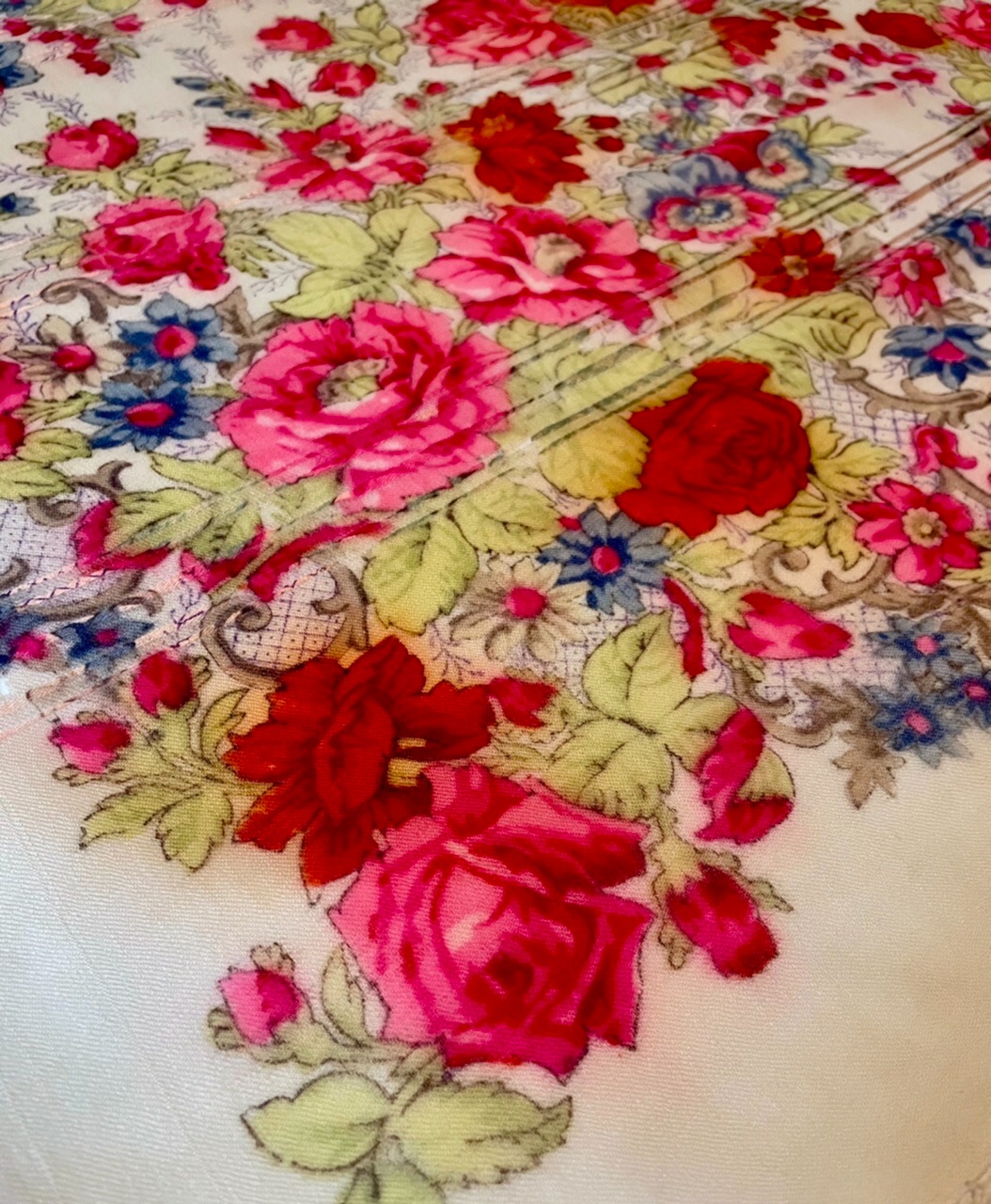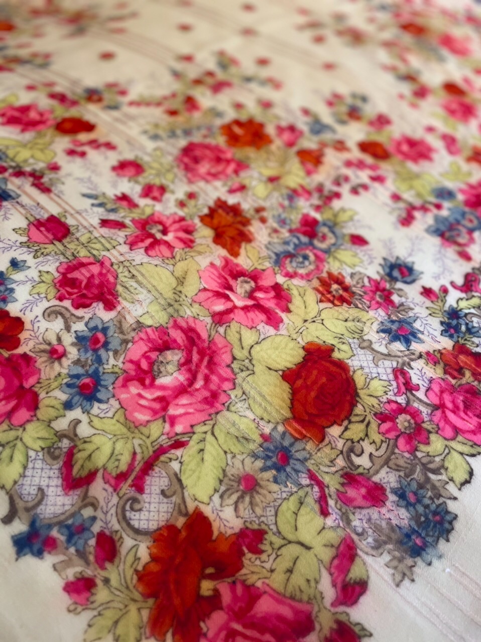Рисунок платка незатейлив, представляет собою рамку по краям платка, средник украшен штампочками из бутонов роз. В рисунке рамки маленькие букетики роз чередуются с декоративными элементами, фон рамки заполнен мелкой россыпью геометрических фигур. Даже удивительно, что такой маленький рисунок застраховали.))) Аналогов в нашем архиве не нашла.