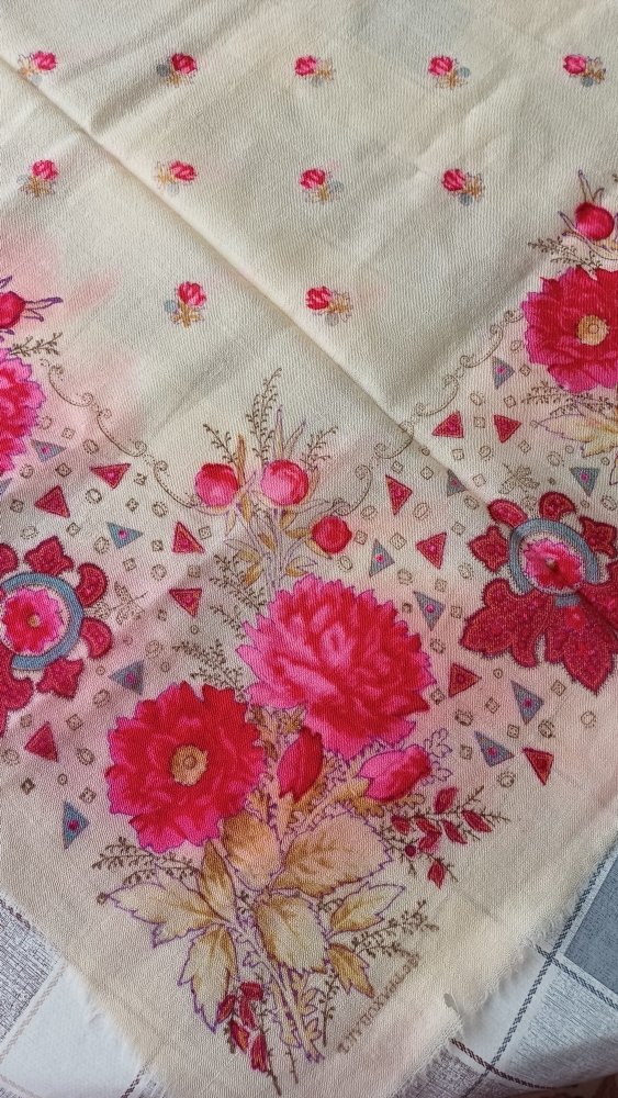 Шаль шелковистая и тонкая. Местами посеклись шёлковые просновки, но дырок нет. Подшита по двум сторонам. Неумелая стирка привела к тому, что в некоторых местах подтекла бордовая краска. Может быть попробую вывести