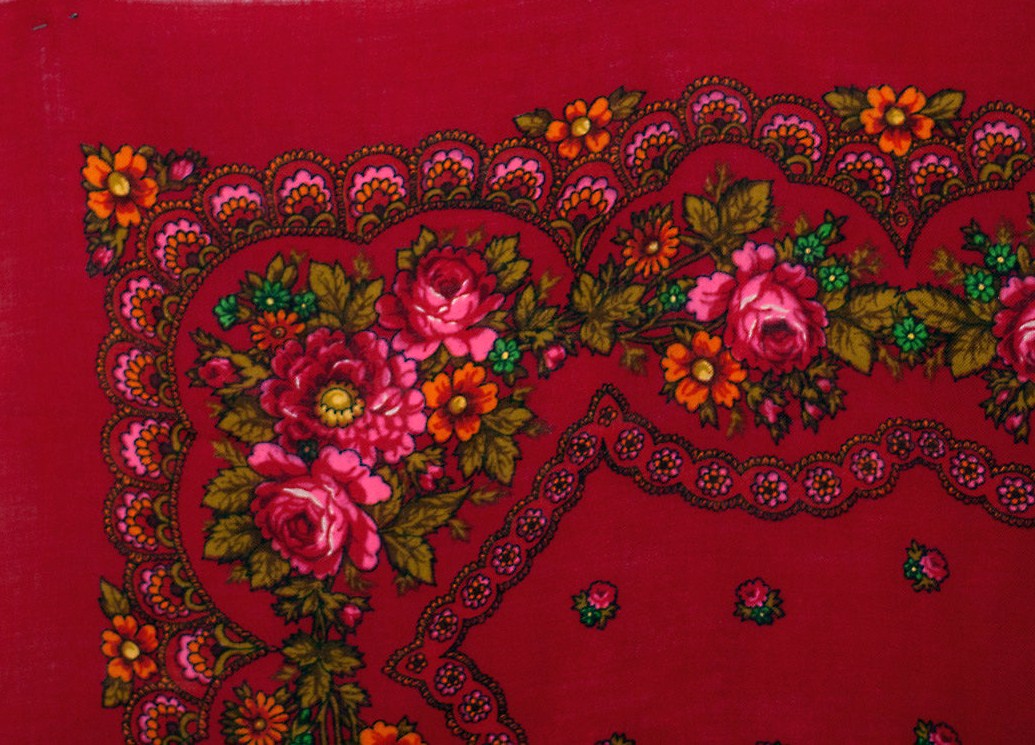 А вот для малинового я сделаю отдельную полочку. На мой беглый взгляд, платочек может быть из Павловского Посада. Сделайте, пожалуйста, фотографии фрагментов. Заметила в орнаменте несвойственный ППМ элемент... Тоже может быть из Баку, как и чернопольный.