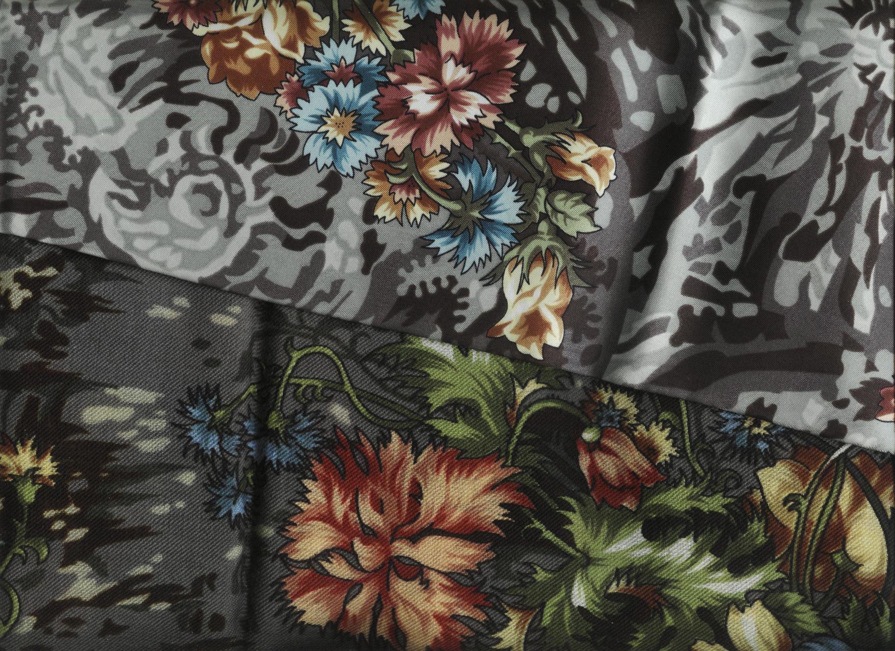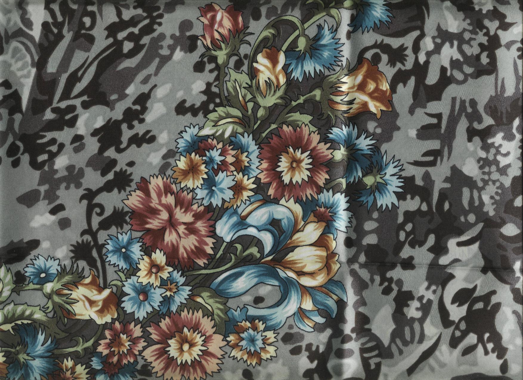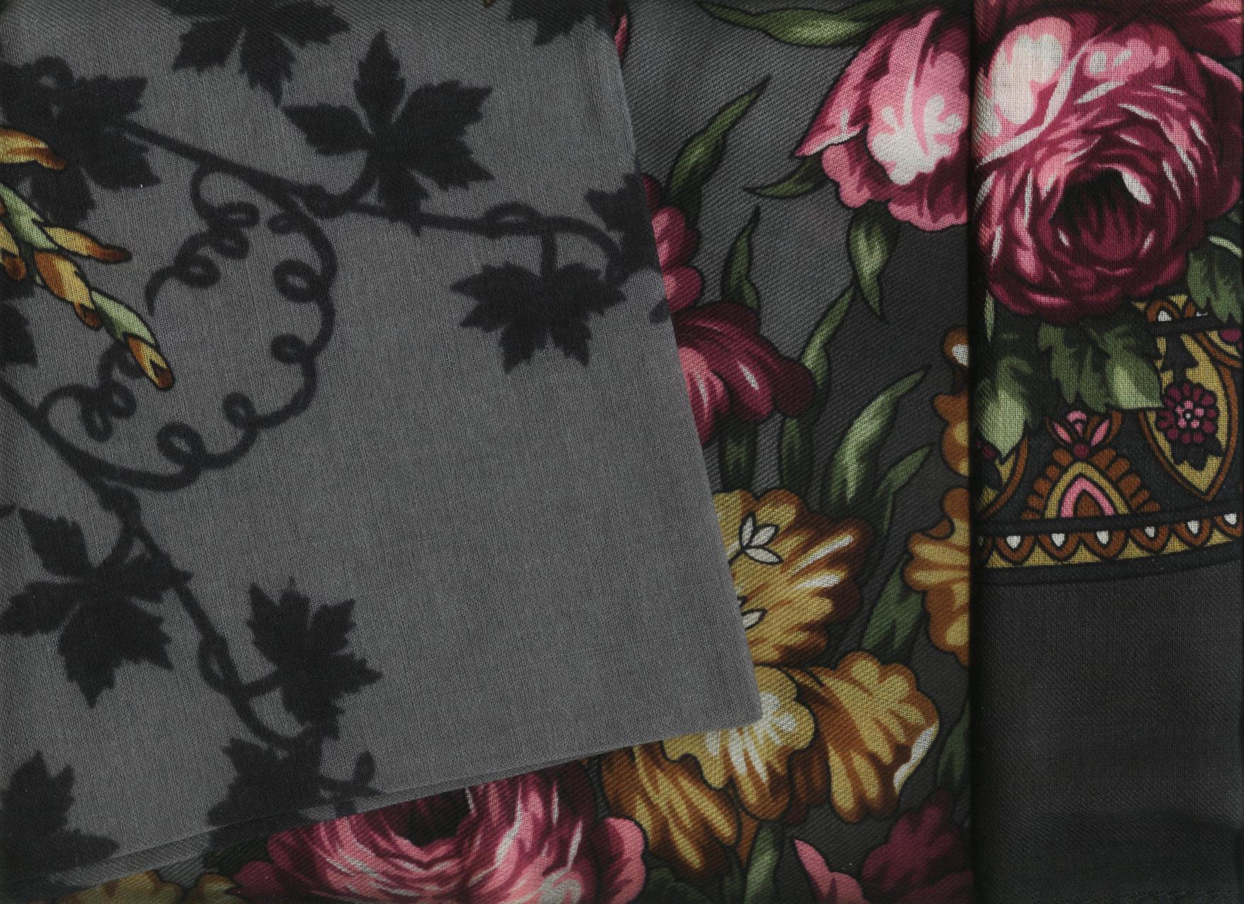 Коричневый колорит очень сдержанный, благородно-изысканный. Хорош для повседневного ношения с плащом или жакетом в весенне-осенний период. А серо-зеленый - изумительно красив. Ощущение, что цветы не В рисунке, а рассыпаны НА платке. Особенно усиливали этот эффект пронзительно (на мое восприятие) голубые васильки. Но, увы, всего не купишь, пришлось сделать выбор с пользу более подходящего к гардеробу платка.