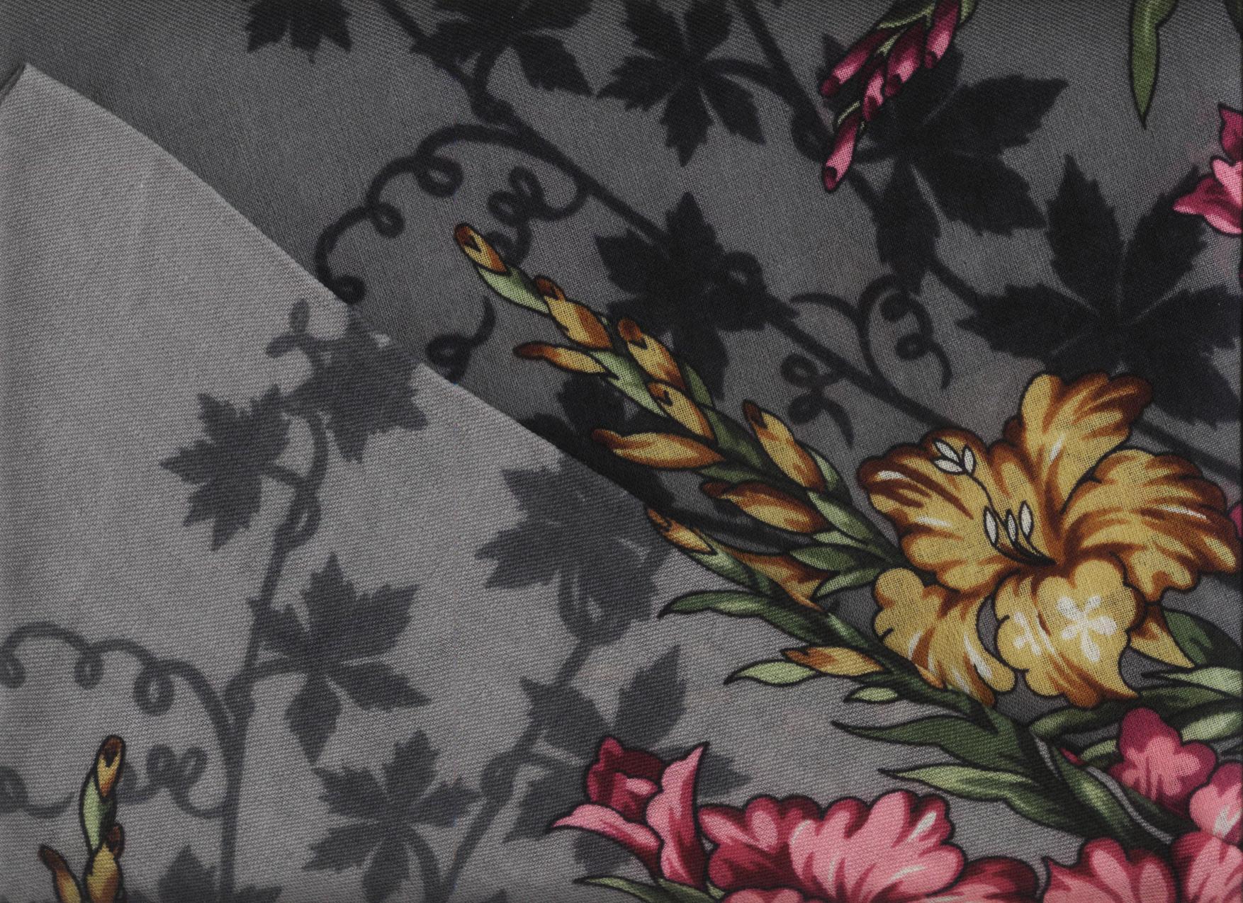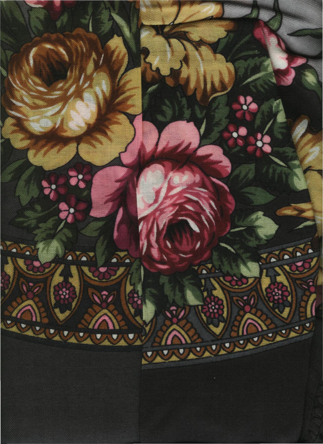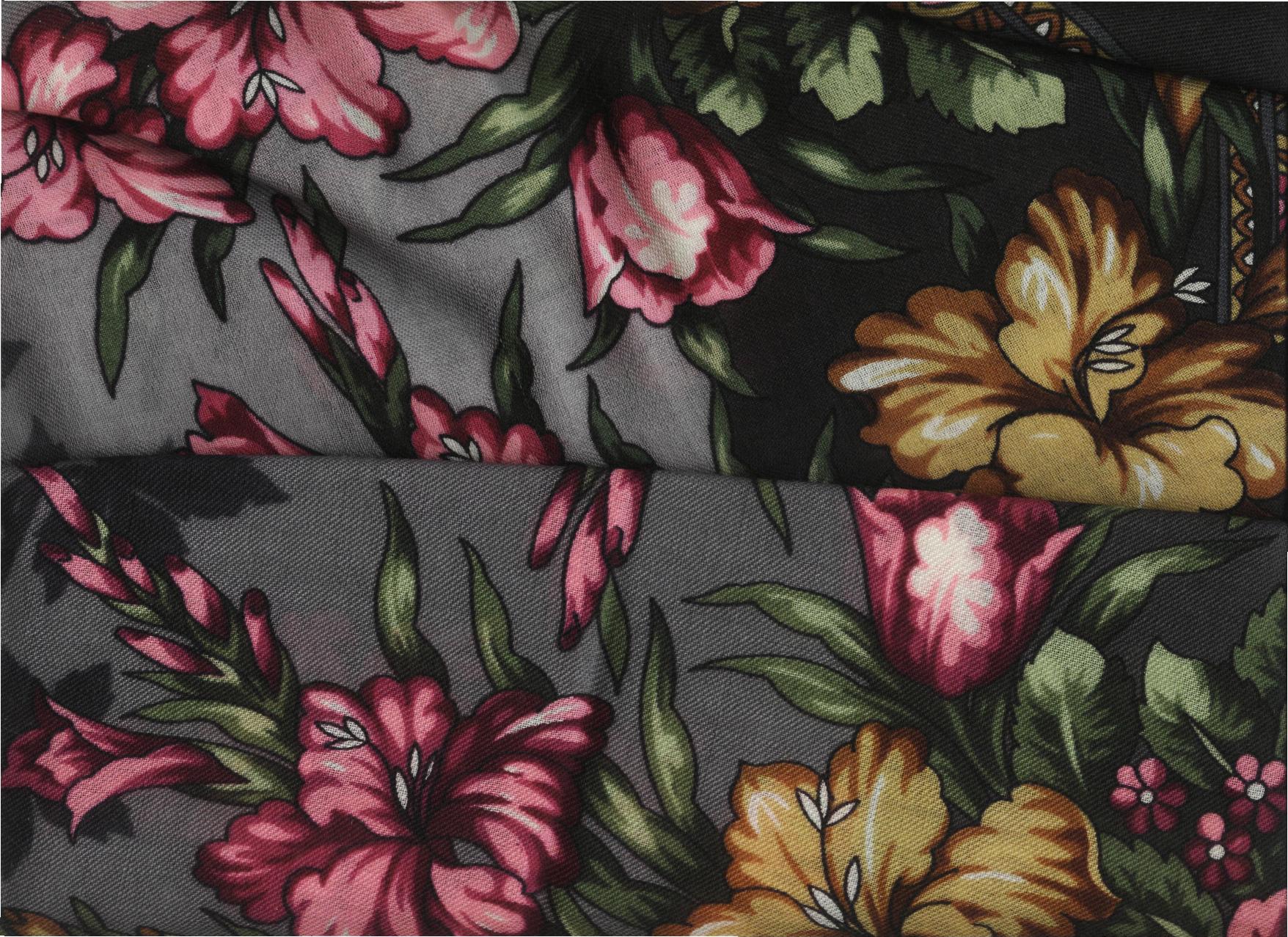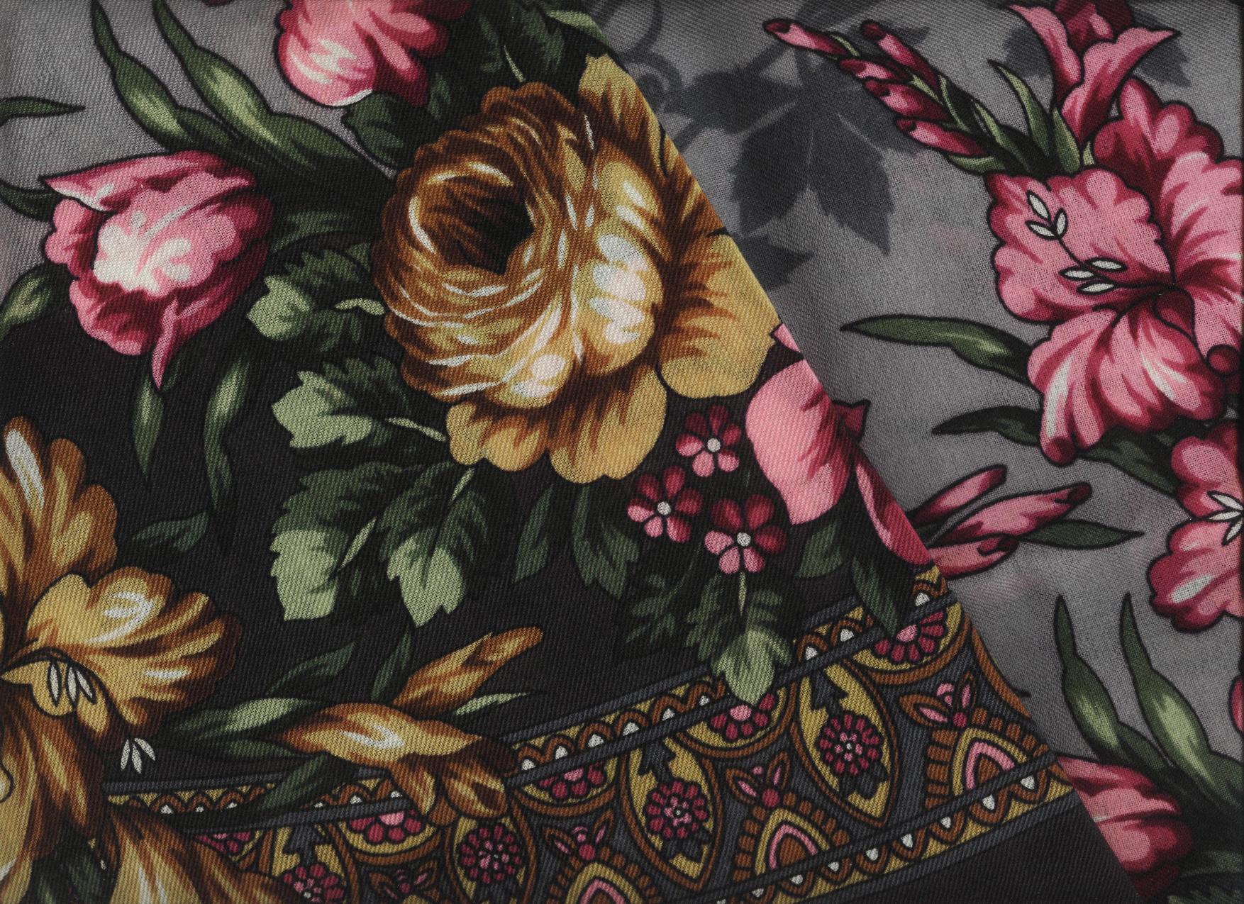 Коричневый колорит очень сдержанный, благородно-изысканный. Хорош для повседневного ношения с плащом или жакетом в весенне-осенний период. А серо-зеленый - изумительно красив. Ощущение, что цветы не В рисунке, а рассыпаны НА платке. Особенно усиливали этот эффект пронзительно (на мое восприятие) голубые васильки. Но, увы, всего не купишь, пришлось сделать выбор с пользу более подходящего к гардеробу платка.