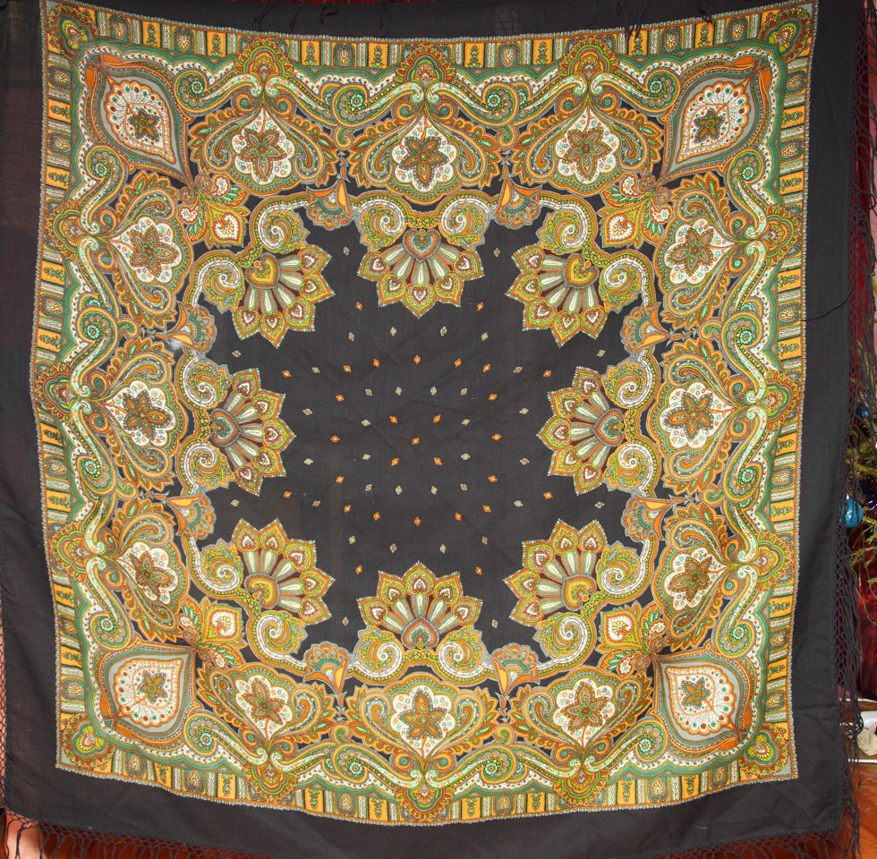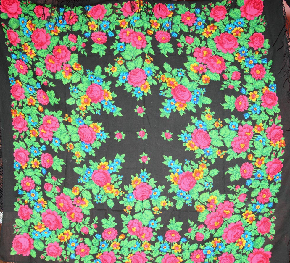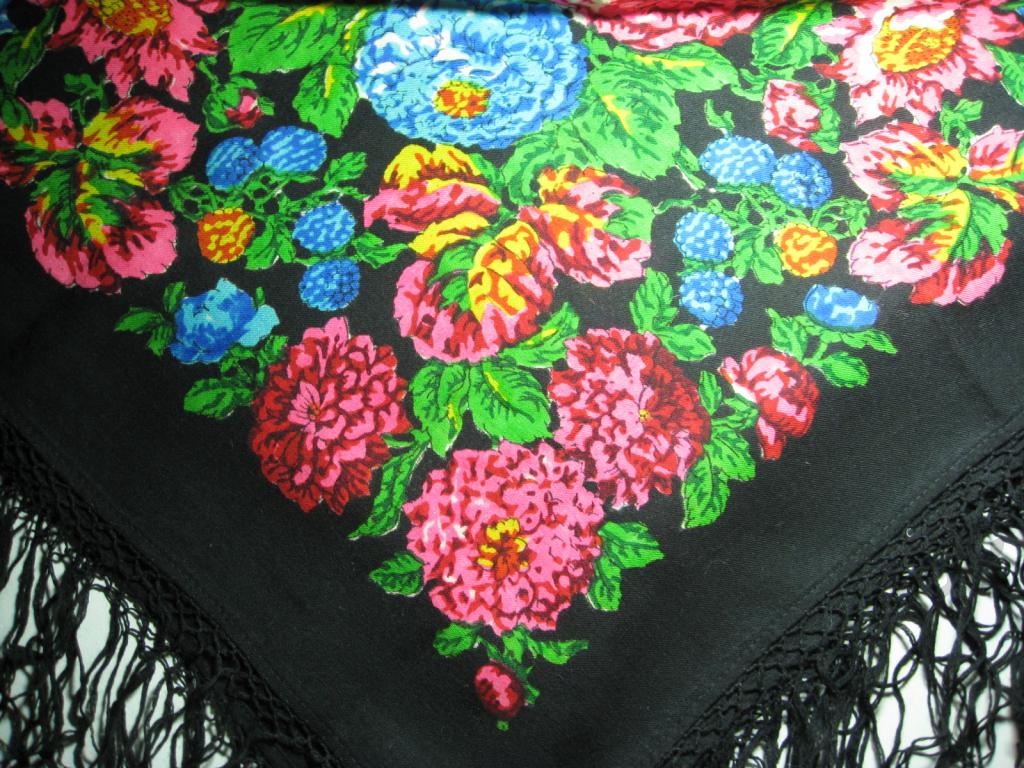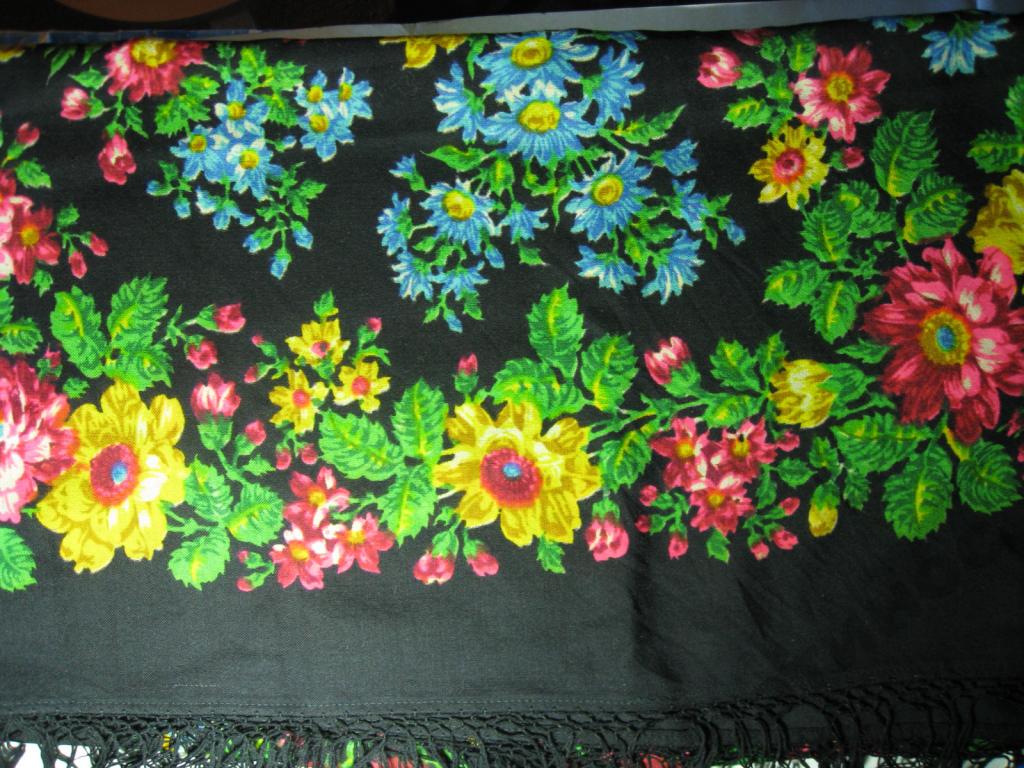 Это цвета, из которых в основном платок и состоит. Ну, и немножко белого. Кайма платка широкая абсолютно черная, 9 см. Кисти шерстяные, тоненькие, бяка. Они уже у нового платка сбиваются в кучки. Подумаю, что с ними делать.