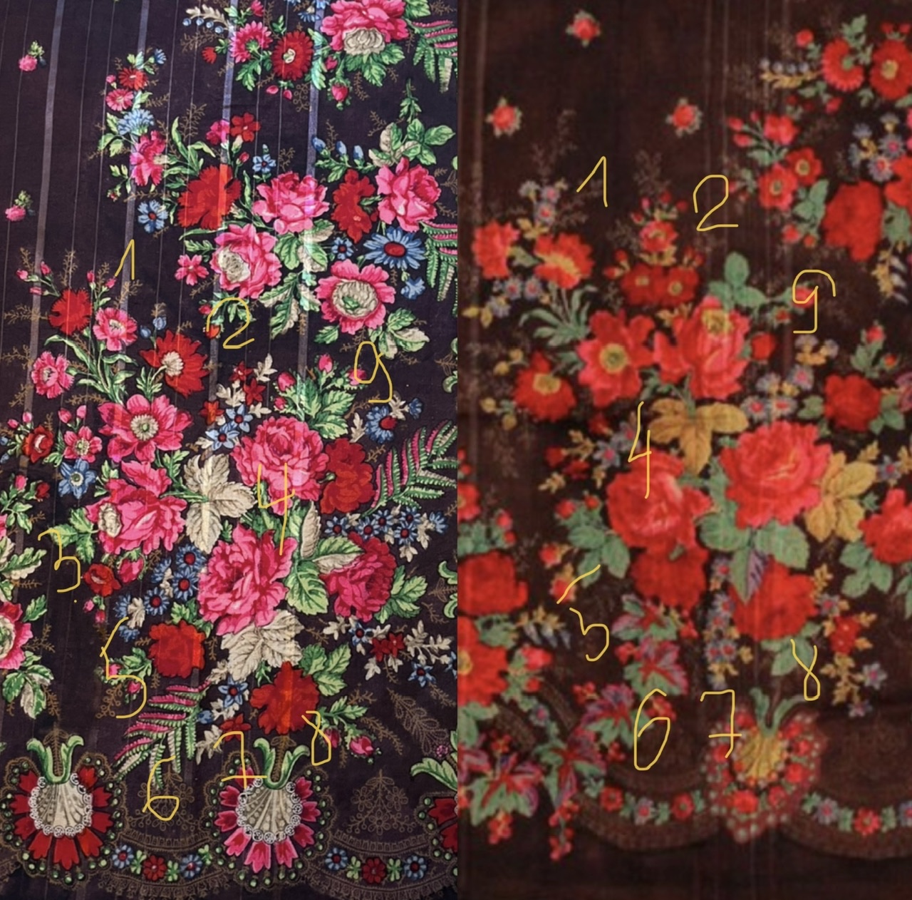 Не могу сказать, какой вариант сложнее по рисунку. Но эта история ещё раз подтверждает то, что шали по одному рисунку печатали на разных предприятиях. Возможно, была договоренность о том, что необходимо вносить изменения. Прямо хочется вживую сравнить эти шали. Будем искать…