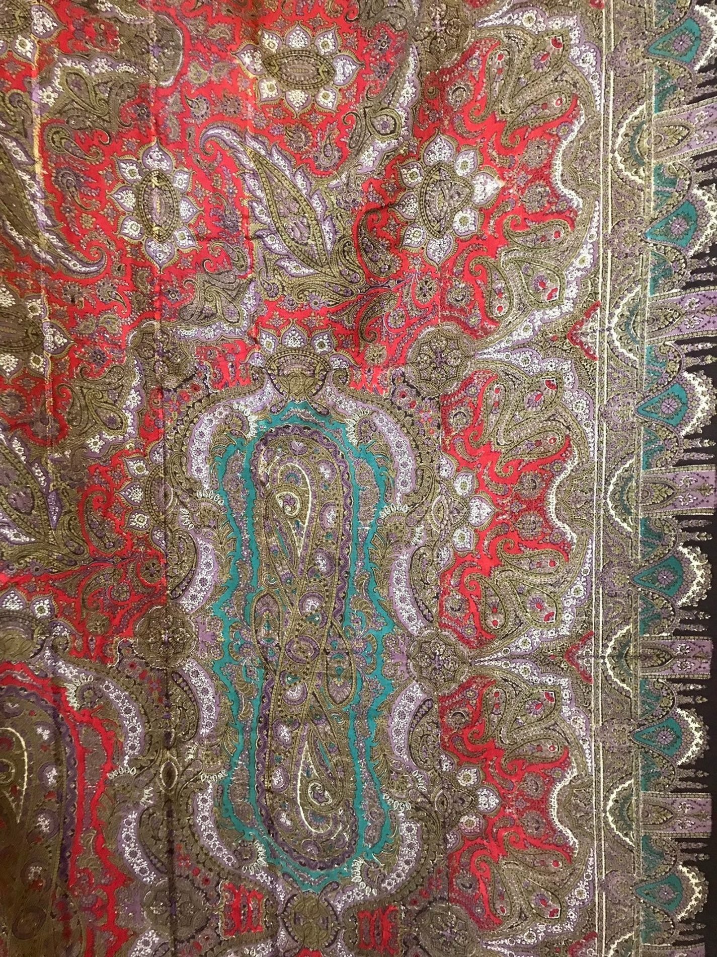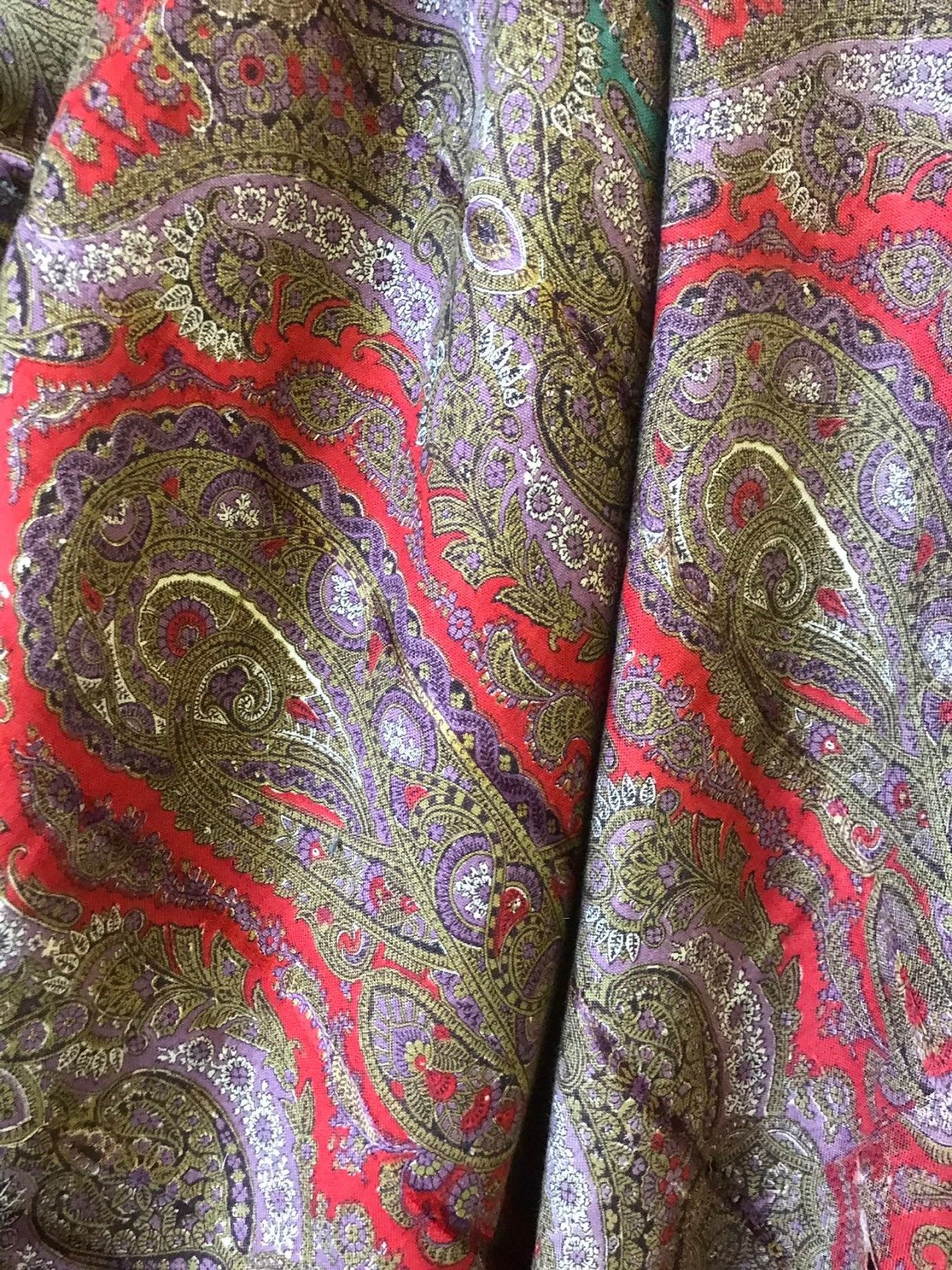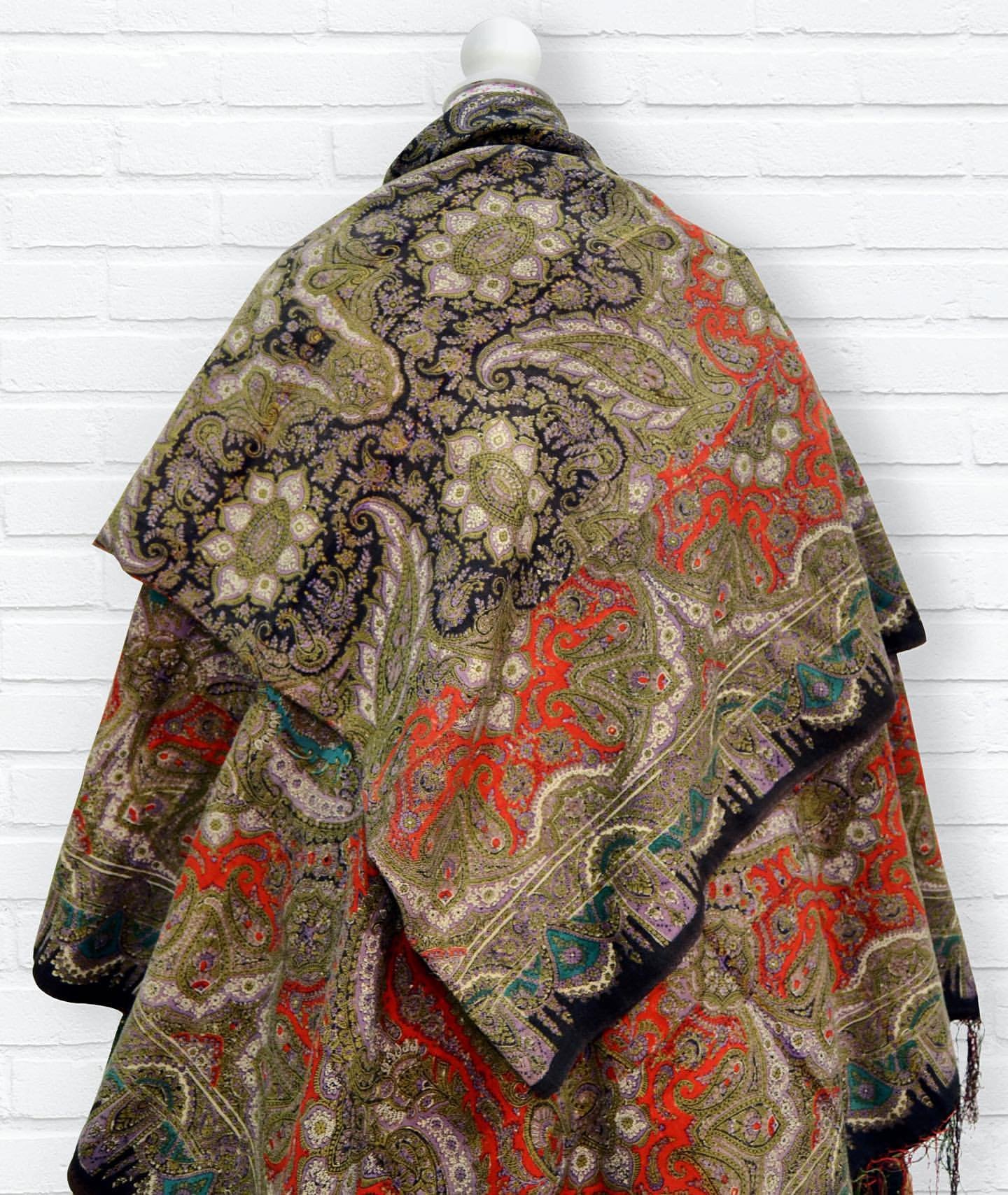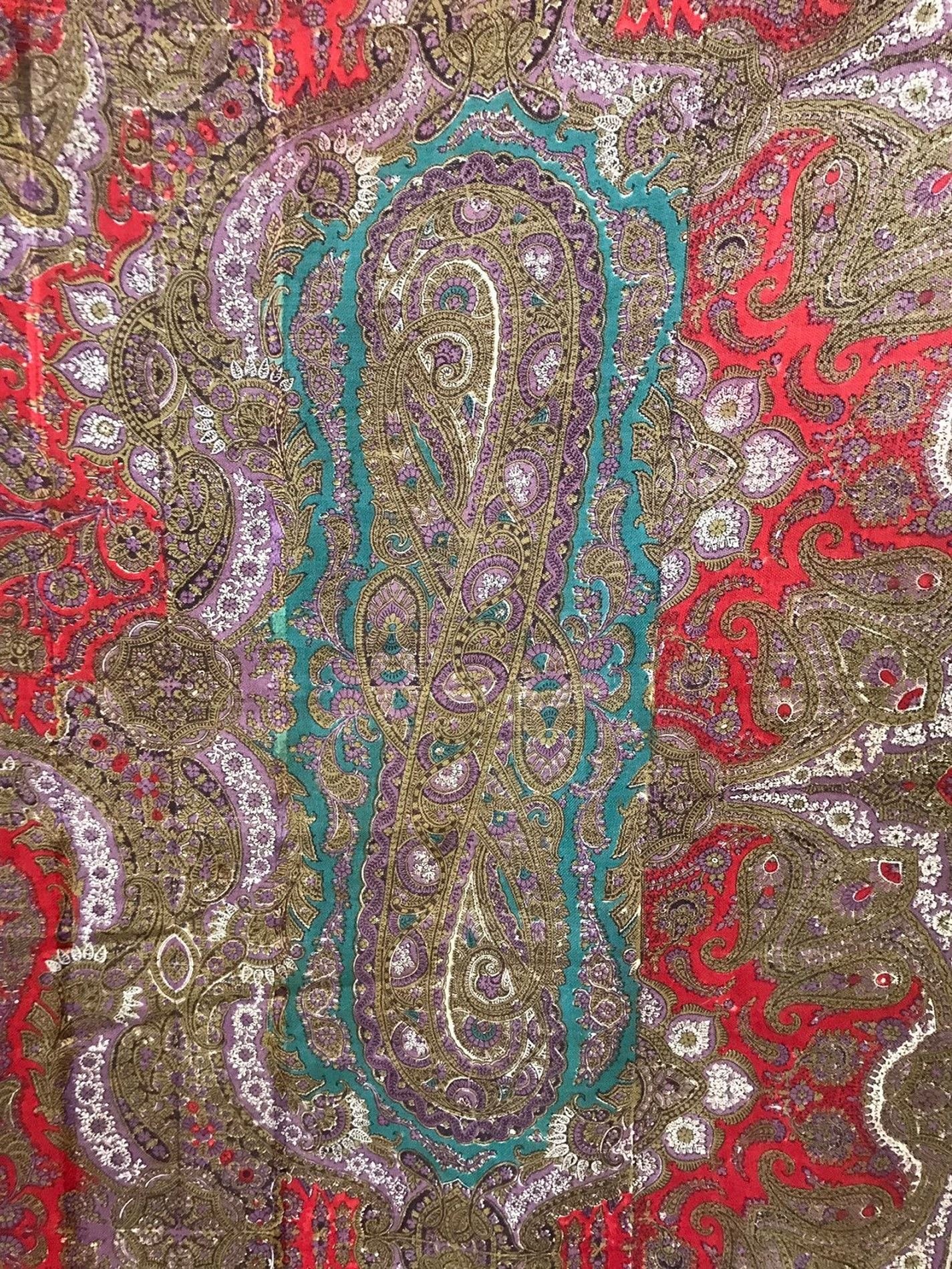 Старинная шаль, тонкая шерсть/шелк, с просновками, ручная набойка, рисунок пейсли ярких цветов, с 1860 гг.
