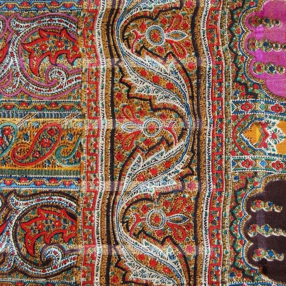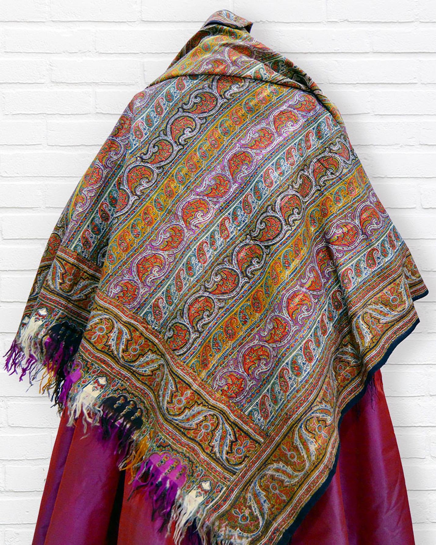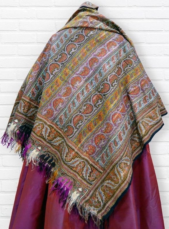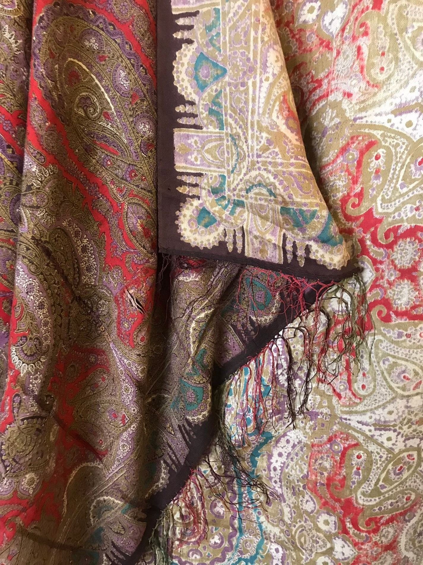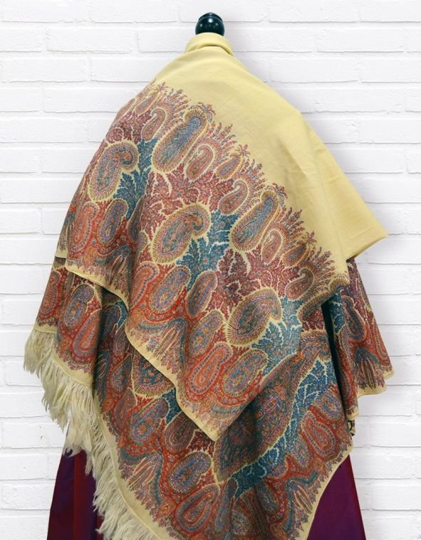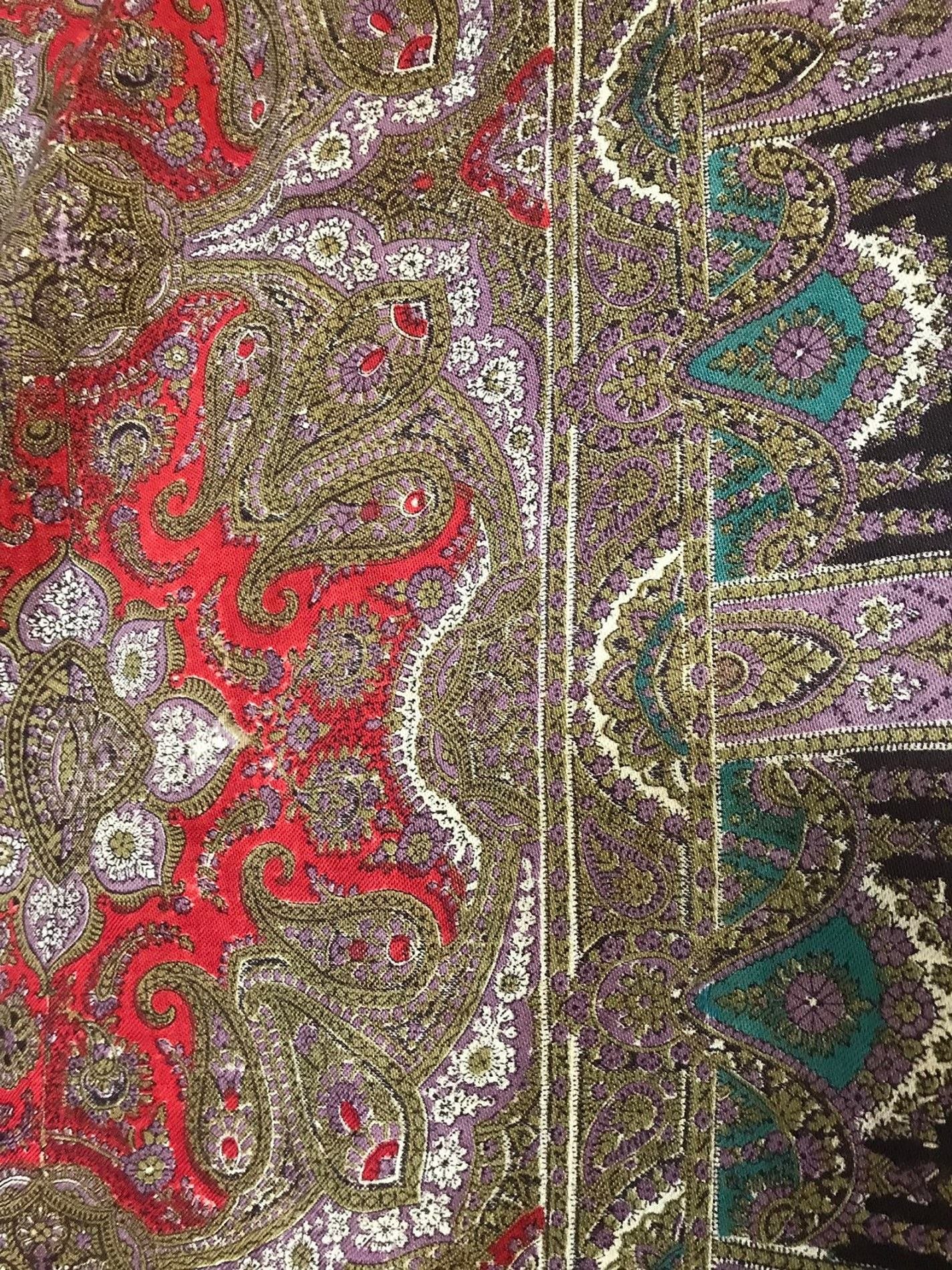 Старинная шаль, тонкая шерсть/шелк, с просновками, ручная набойка, рисунок пейсли ярких цветов, с 1860 гг.