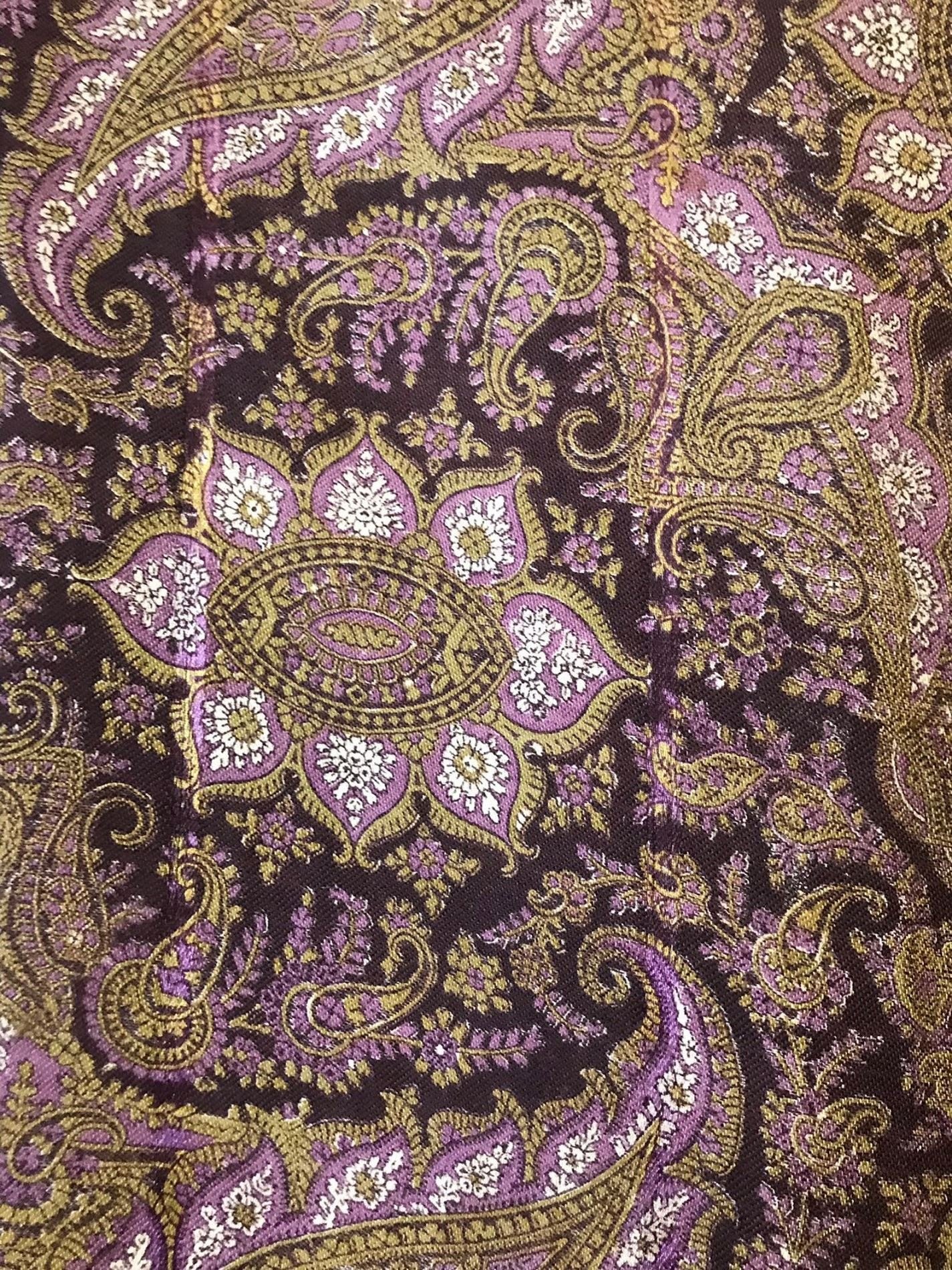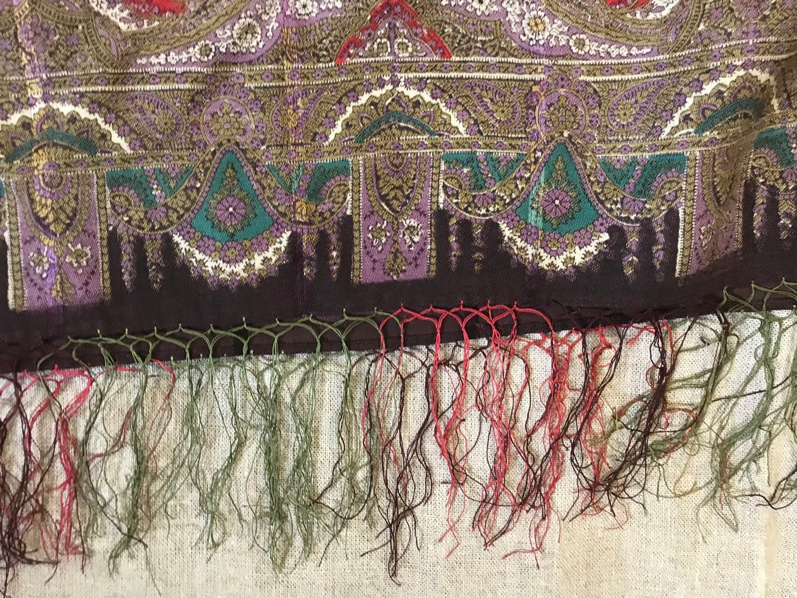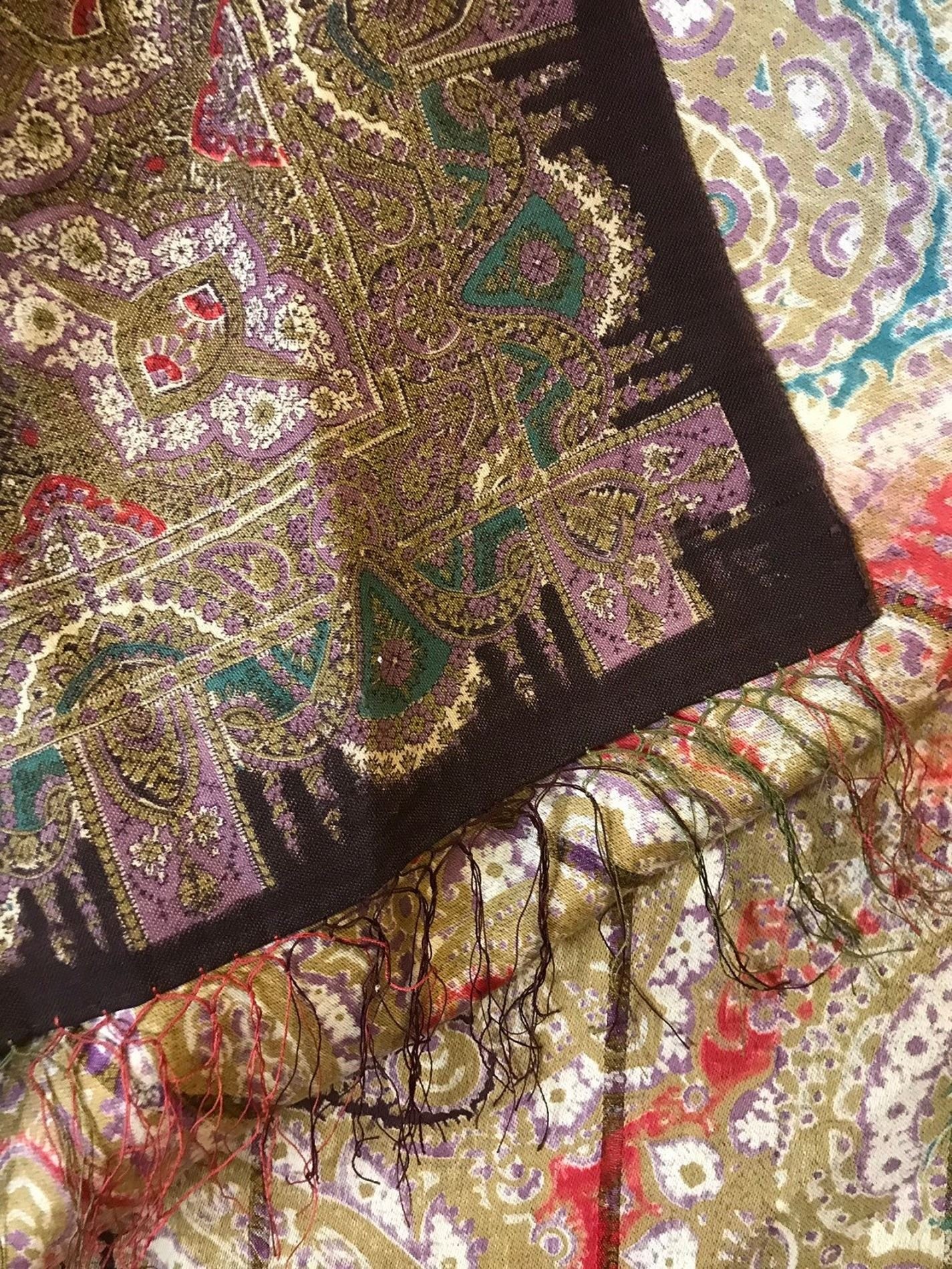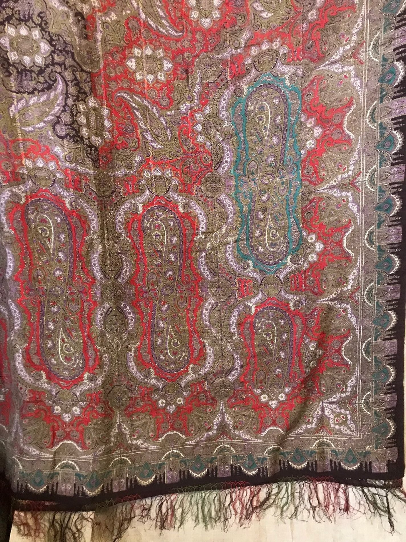 Старинная шаль, тонкая шерсть/шелк, с просновками, ручная набойка, рисунок пейсли ярких цветов, с 1860 гг.