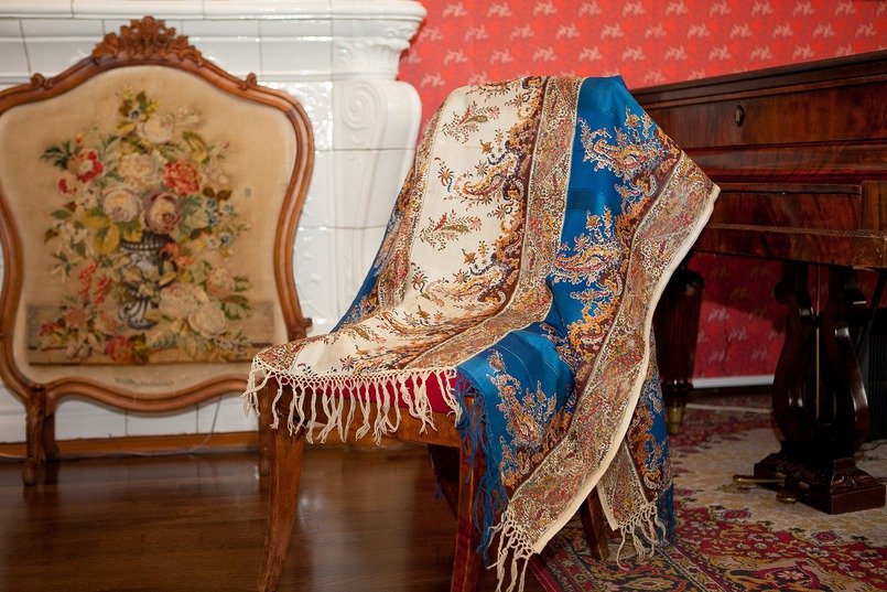 Шали были разными и являлись неотъемлемым атрибутом парадного и повседневного портрета…Модные новинки попадали и в Сибирь. Одна из них сохранилась до сих пор, спустя почти два века после жизни в Иркутске семьи Волконских. Эта изящная вещь, сотканная из шерсти и настолько тонкая, что её легко можно продеть через кольцо, до сих пор не утратила яркости и контрастности рисунка и восхищает красотой орнамента.
