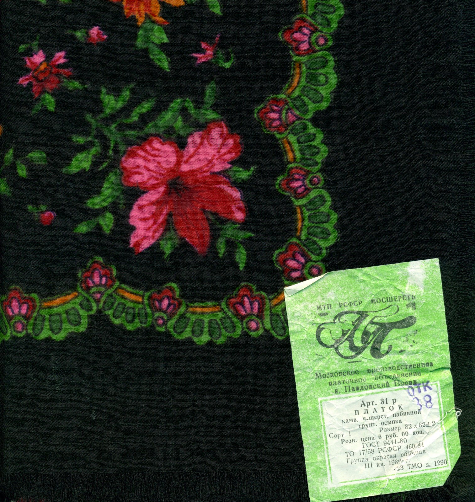 Платок шерстяной 82х82 с широкой квадратной цветочной рамкой с фестончатыми краями: ЭТИКЕТКА МППО 1989