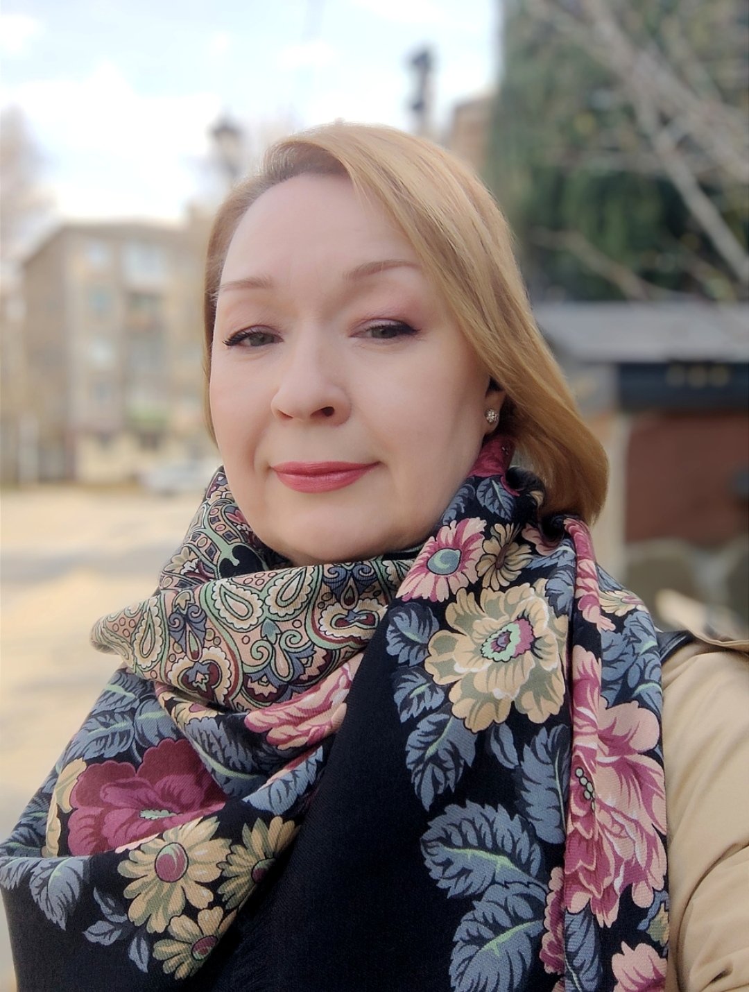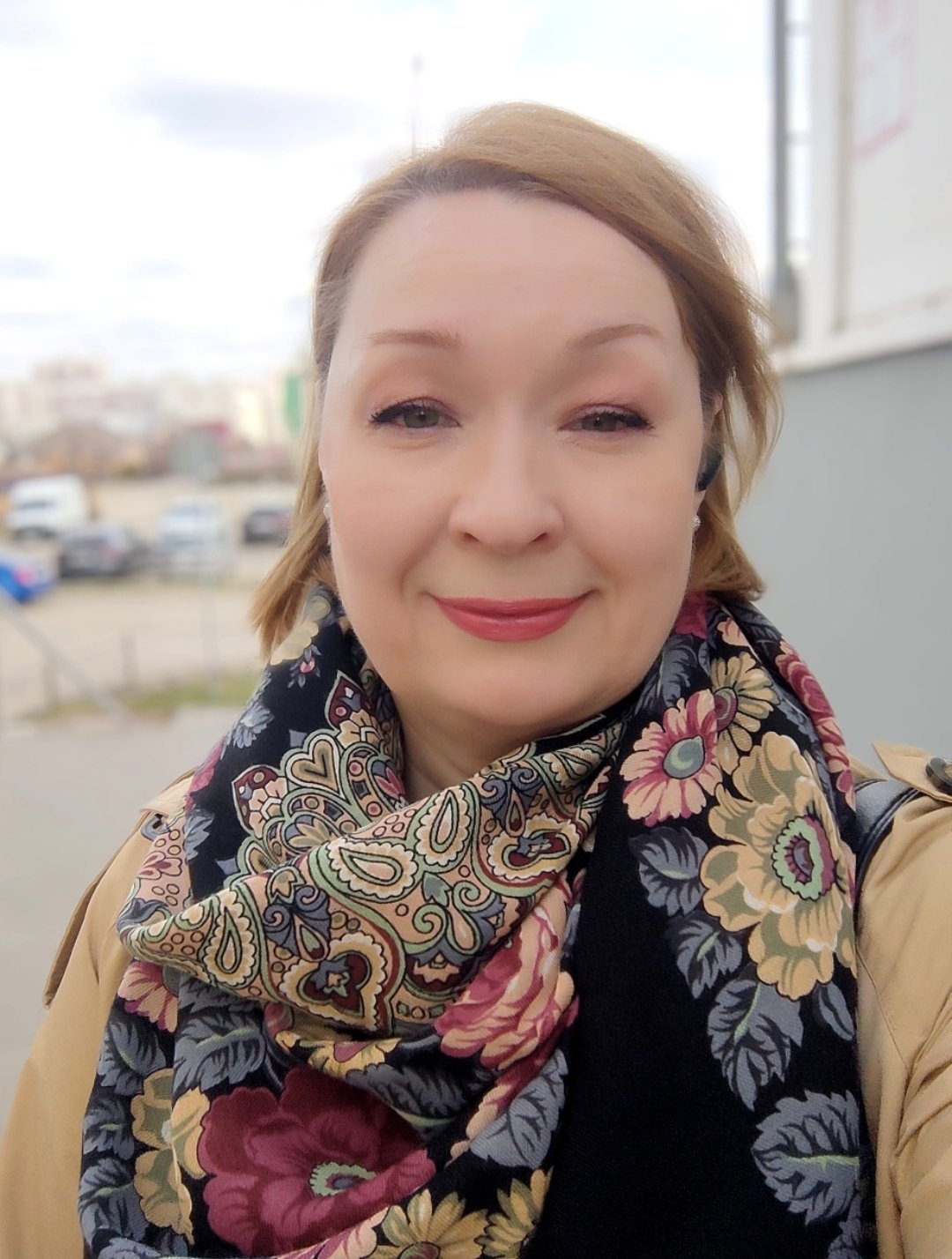 Какое удачное сочетание верхней одежды и бежевых цветов в платке. А помада подчеркивает глубину ярких роз.