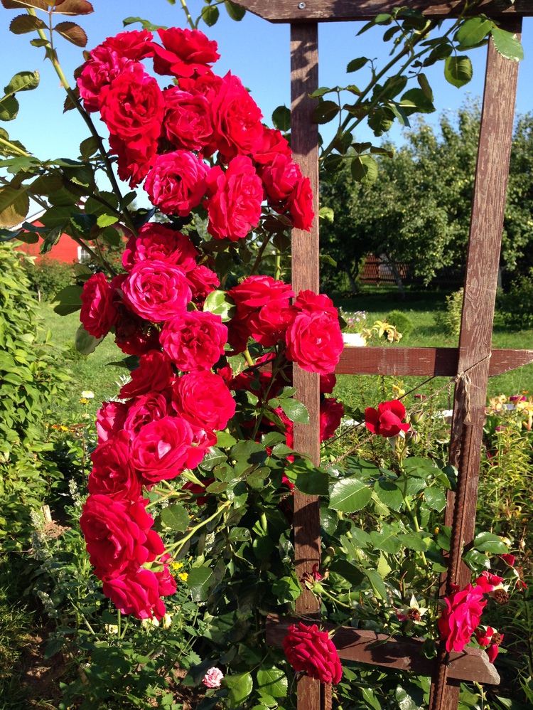 Но что интересно, у соседей у крыльца растет большой куст роз около метра ростом. Цветет почти круглое лето бордово-вишневыми розами, не обрезают на зиму, не укрывают. Это не шиповник и не что-то старое, кусту года 4-5. Вот только не помнят они, что это за роза, купили-посадили и все.