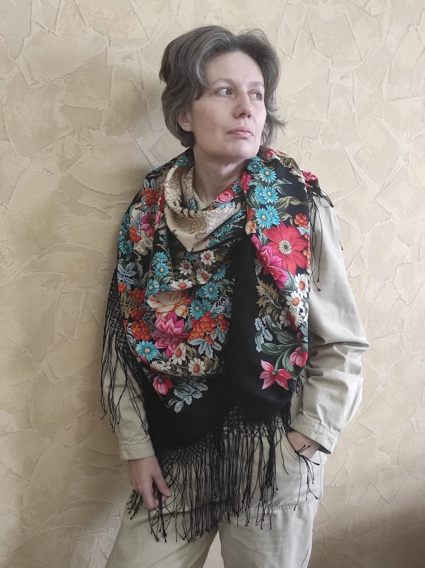 Мариночка, ну, красотка же! Стильная и кокетливая при том! Отлично выглядишь, стрижка, цвет волос, очки, платье льняное, украшения - всё тебе очень идёт! Ну, а платки - просто как там и были!
