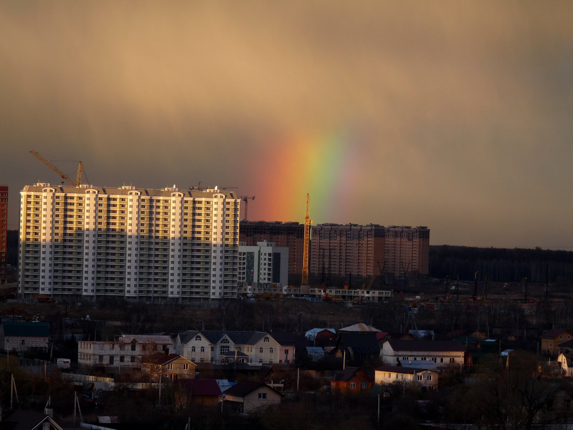 Сегодня так темно и пасмурно, а пару дней назад была радуга. Видно было только ее основание, но такую широкую радугу я никогда не видела. Немного подкрутила контрастность, так как на фото получилось бледнее, чем в жизни. На фото - Москва заМкадная строится.