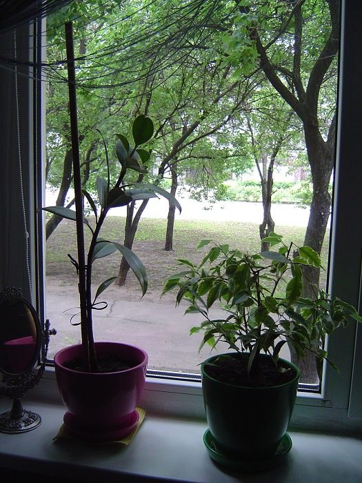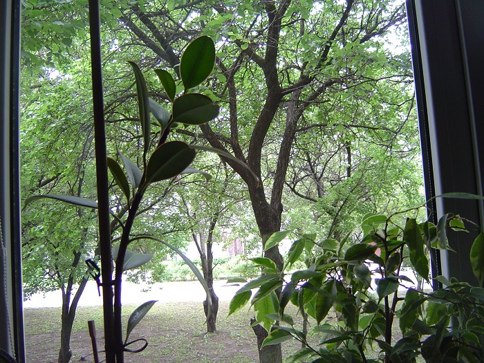 А из моего окошка только улицы немножко, а прямо под окнами фруктовый сад - абрикос, груша, вишня, слива и яблони. (и это в центре города, метрах в 100 от первой линии, проспекта Ленина).Чуть дальше кусты сирени, весной такой аромат!!! Под окнами у меня тень и сколько не пыталась что-нибудь посадить-не растет, да и вытаптывают любители абрикос.