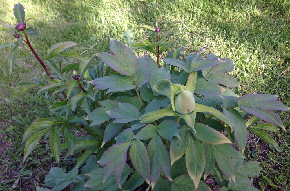 потом какое - то время не заглядывала, а вчера с удивлением обнаружила, что там уже два пиона. Травянистый пион, на который был привит древовидный тоже дал побеги и собрался цвести.