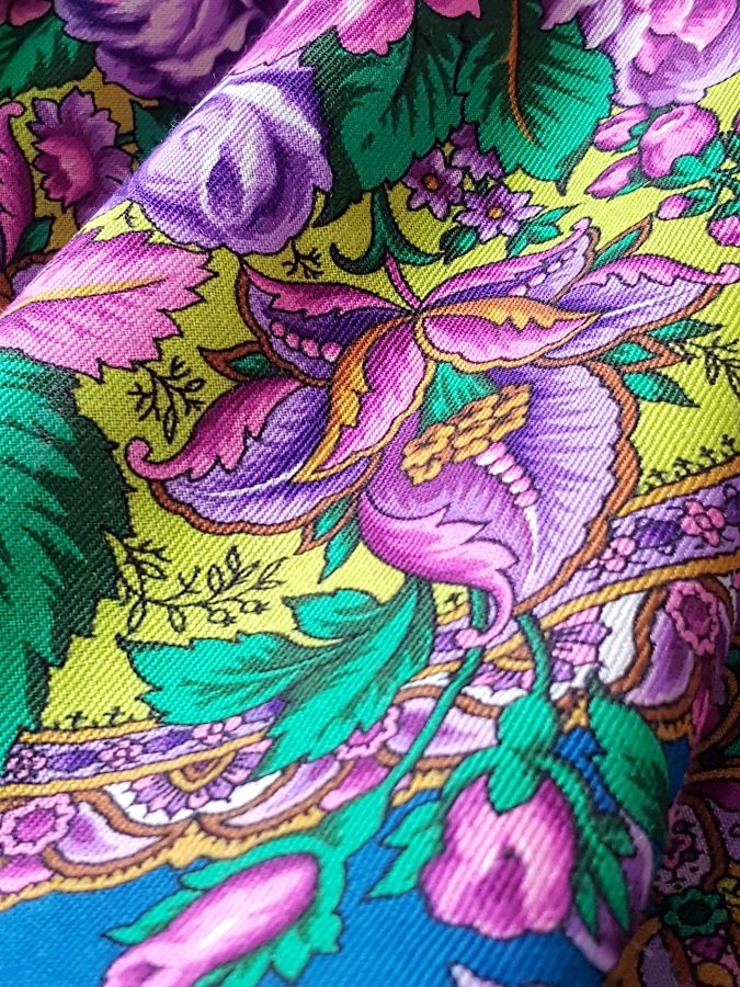 На фото он резче получился у меня. Очень приятный, даже не броский, повседневный платок, несмотря на богатство и пестроту сочетания узоров. Повседневность ему придает отсутствие бахромы. Кайма в тонкую полоску, не доминирует.