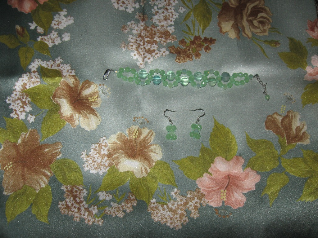 Браслет и серьги из нефрита и флюорита (ручная работа, дизайн Кузнецовой Оксаны) вроде бы неплохо смотрятся с атласным платком "Утренний свет"-10. Жаль, что фото не передаёт мерцание флюорита, которое очень похоже на блеск атласа из натурального шёлка.