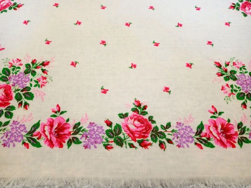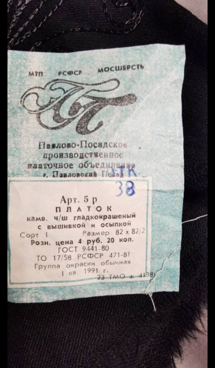 Широко известны (но на форуме пока, кажется, не отражены) однотонные головные платки с машинной вышивкой в одном уголке. Говорят, в 1960-е такие уже выпускали. Здесь сохранила фото с этикеткой 1991 г.