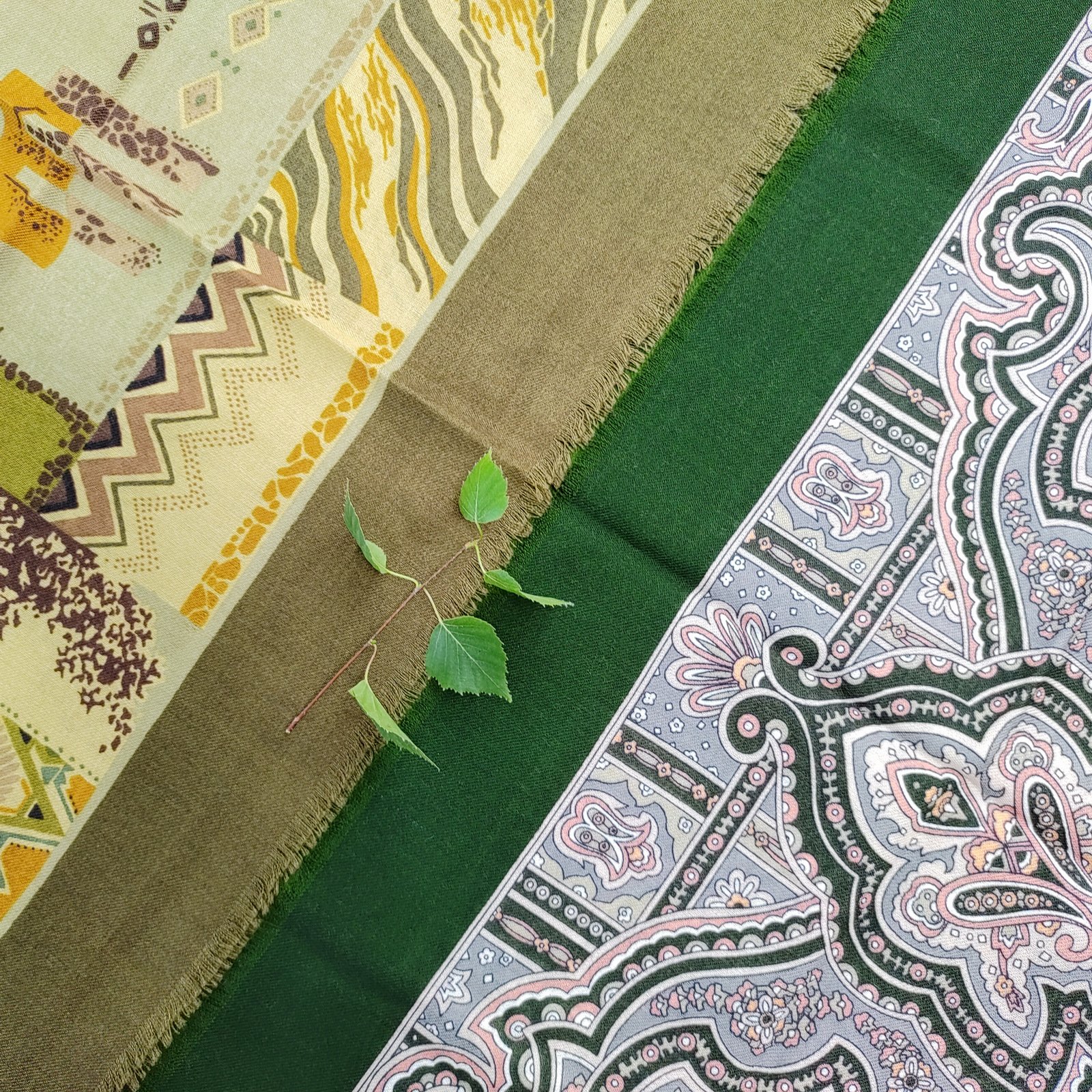 Получила наконец-то свою Иллюзию, сравнила со своими камуфляжными. Для меня она прям зелёная! Очень интересный платочек, по размеру - на плечо просто накинуть или как галстук пионерский повязвть и узел на плечо сдвинуть. И да, надо стирать пробовать, может помягчеет. На фото Иллюзия 10, Свет в окошке 10 и Запах мёда и роз 16.