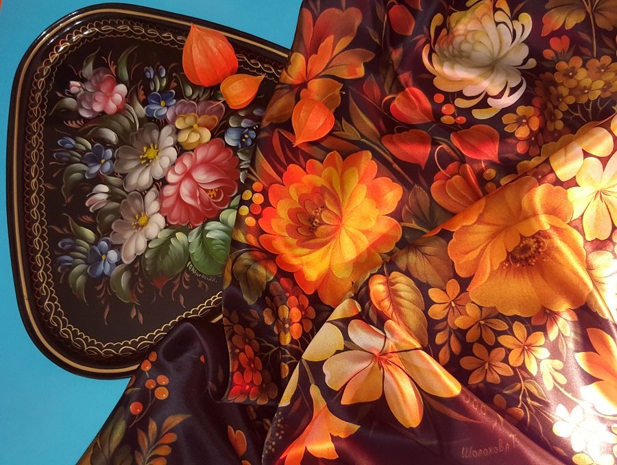 Платок шелковый (атлас) "Жостовский букет" вид 2, 89x89 см. Художник: Шолохова Татьяна.