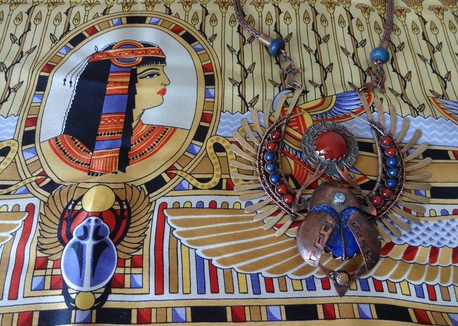Два скарабея. "Скарабей" (атлас), рисунок 1252-16 Валерии Фадеевой и "Скарабей" (лазурит, сердолик, опал в бронзовой оправе) ювелира Сидоровой Ирины.