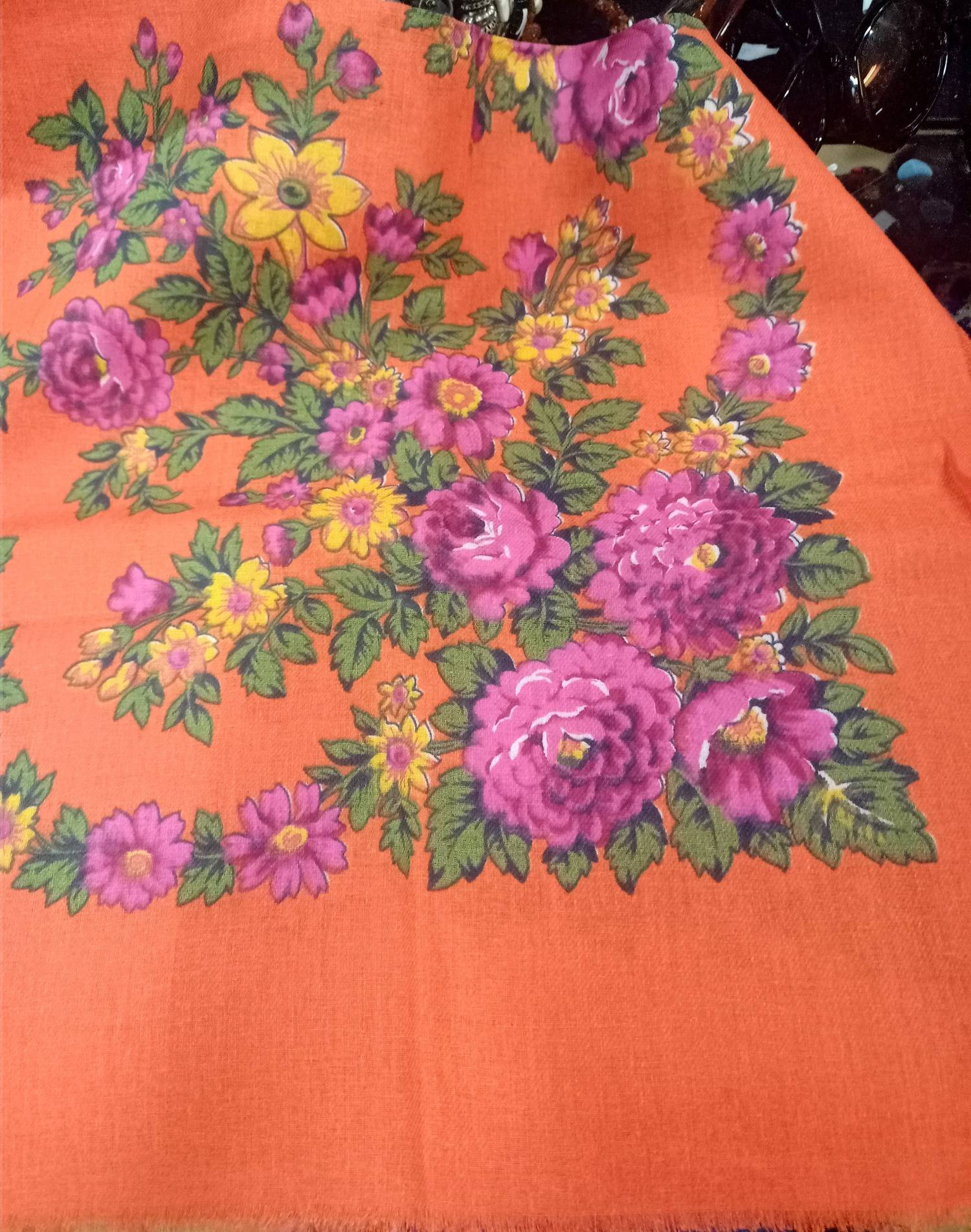 Купила вчера очень славный платочек, грунт цвета морской волны сразил наповал и веночки очень трогательные. Он конечно не идеальной сохранности, и средник выцвел, и дырочки имеются, и бахрома не без утрат, но деньги за него просили смешные, поэтому купила и как оказалось этого рисунка в нашей копилочке до сих пор не было. Размер платка 93 х 93 см, подгибка одинарная, бахрома шерстяная, крупными клетками.