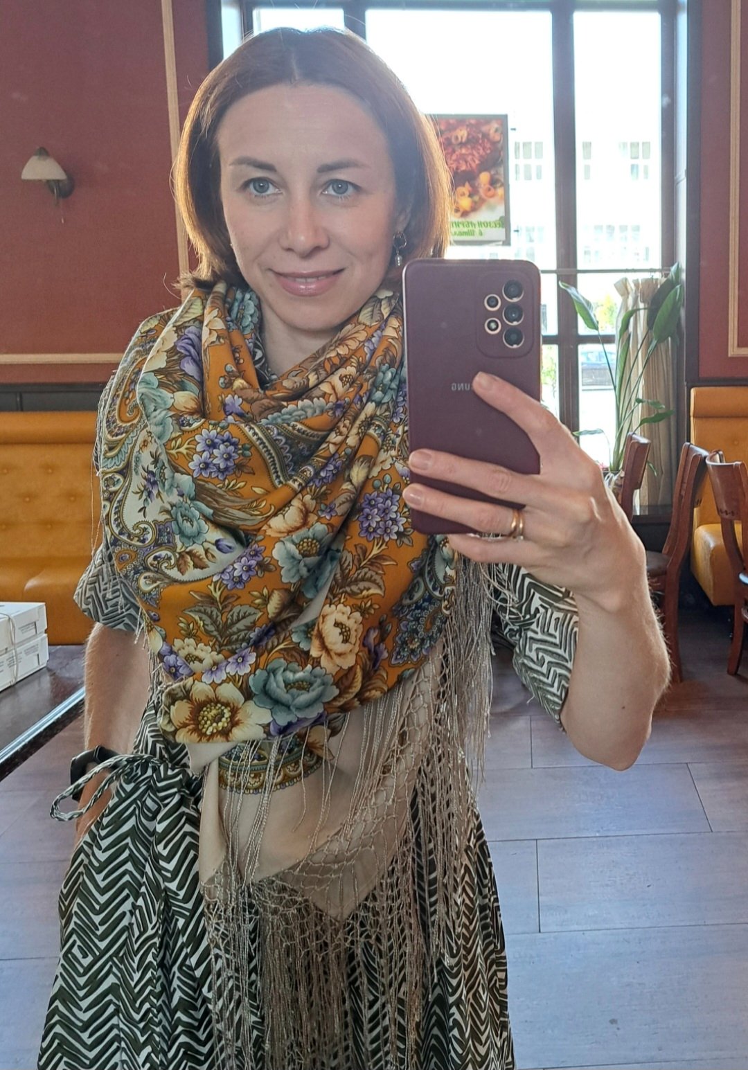 Нравится как вы носите шелковые платки. Вся красота рисунка видна :: И цветовая гамма одежды подчеркивает нежность родонитового колорита платка.