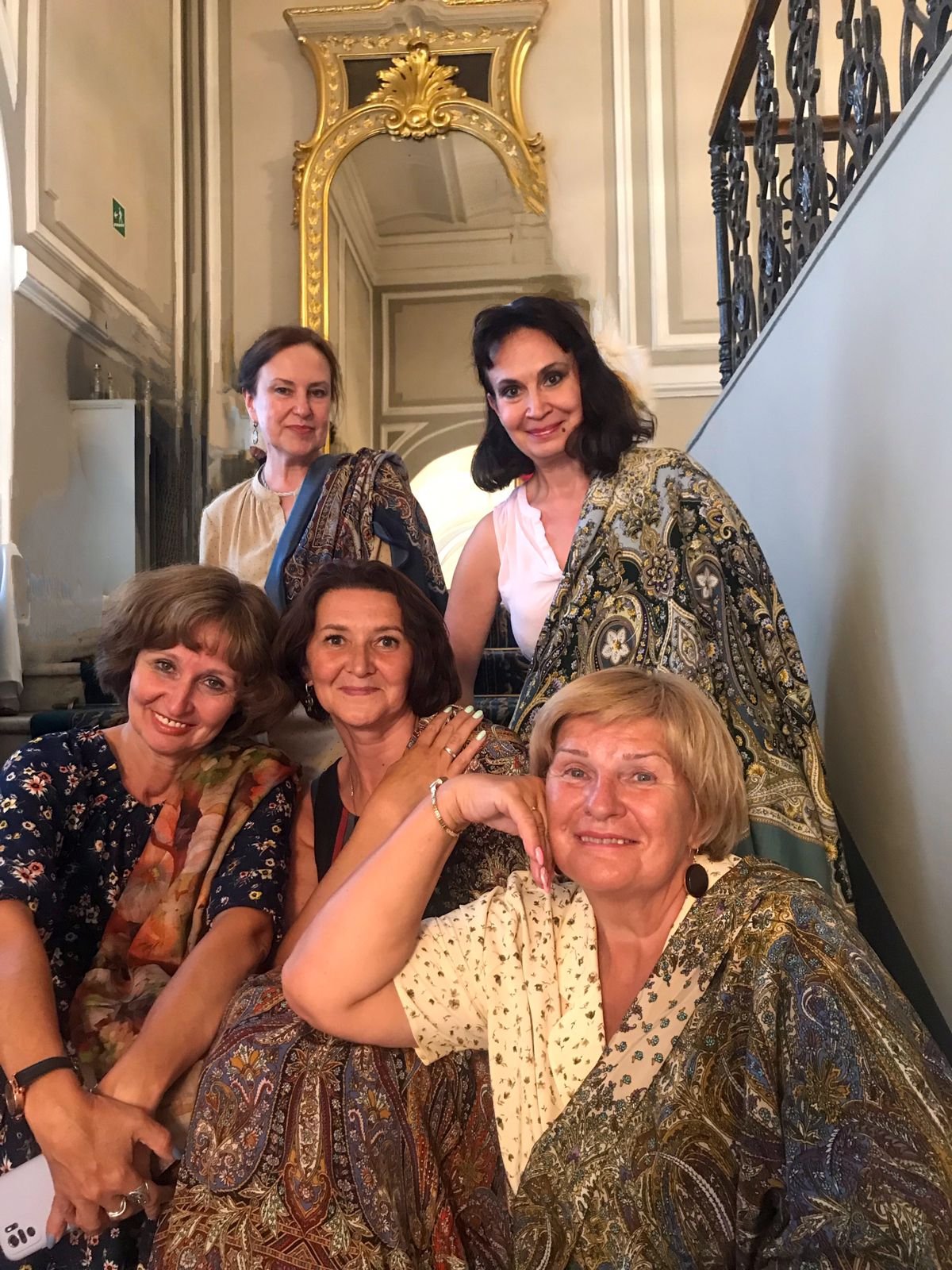 Долго любовалась и нарядами вашими, и платками: стильная Олечка-Дусятко в белой рубашке и в шелковом Санкт-Петербурге, ты в черном платье и шелковом Жасмине, и лучезарная Люся- Аметист в невероятных бирюзовых переливах (платок не опознала, видимо, Палитра?)