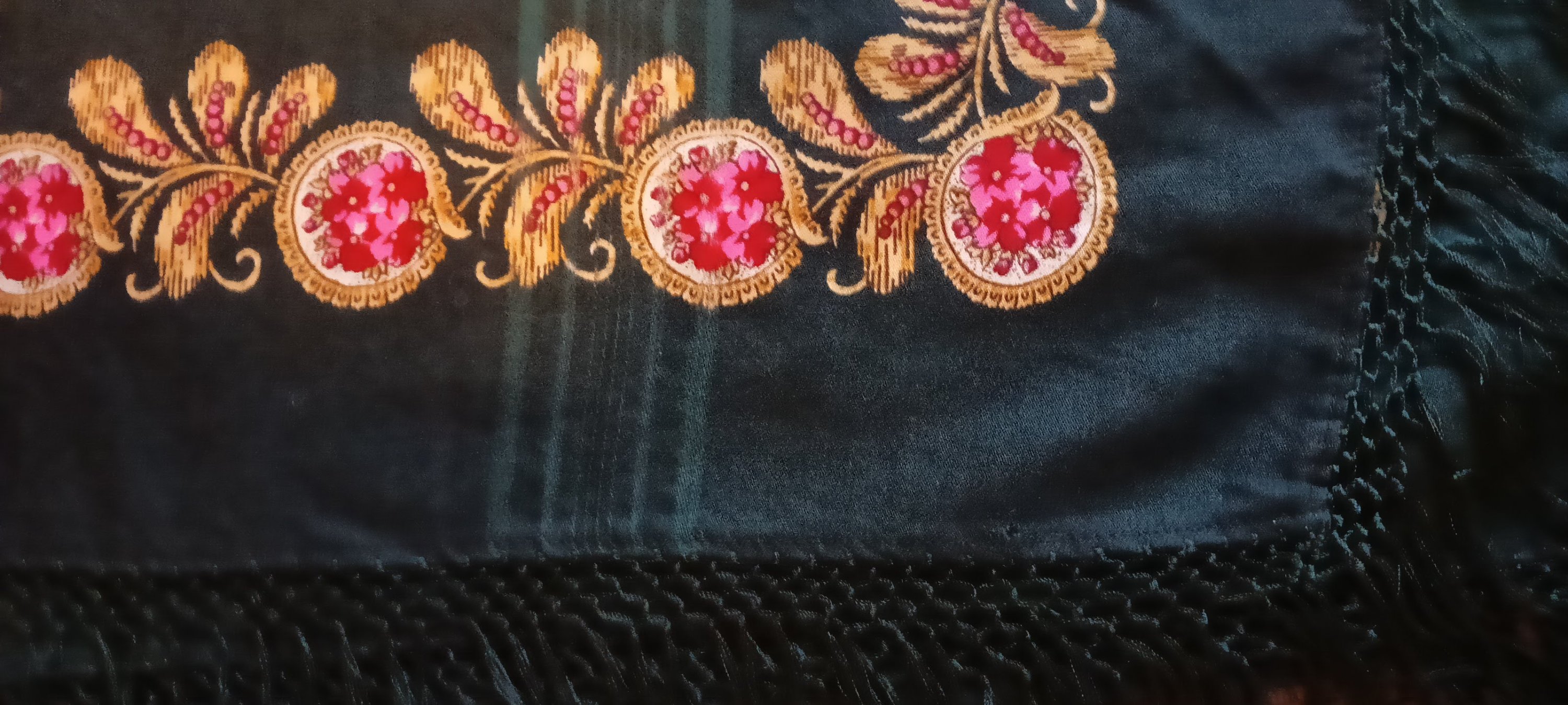 Фон бордовый. Не очень тёмный, но всё-таки бордовый, не красный. В общем, неплохо на фото получился. Причём по всему платку одного цвета, и под "кружевом", и по кайме. Если кажется чуть разным в сообщении выше, то это обман зрения).