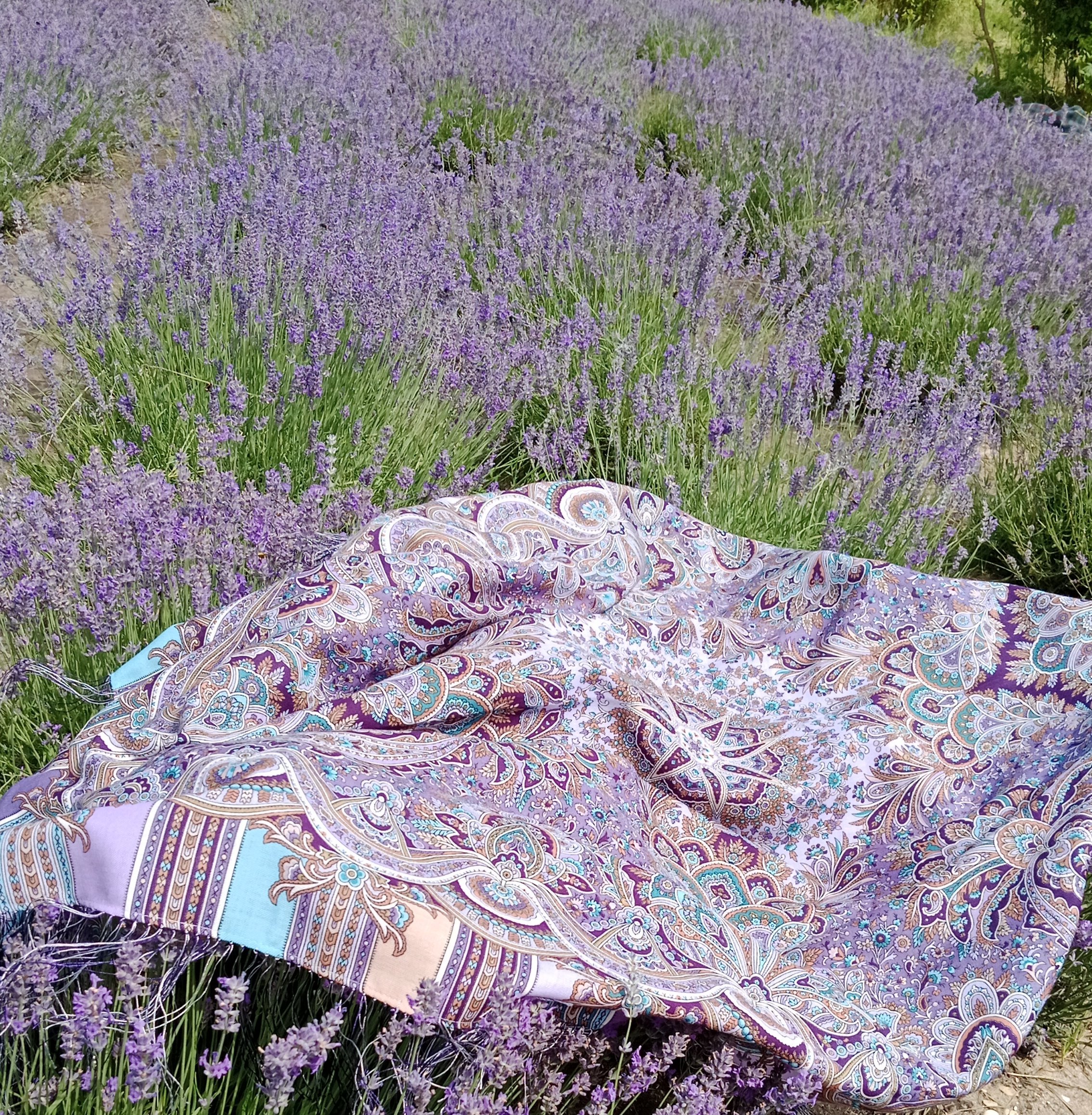 У дочки из квартиры с балкона открывается вид на ботанический сад, и там я заметила поляну с лавандой. А на фотосессию с лавандой нужен был платок. Выбирала.