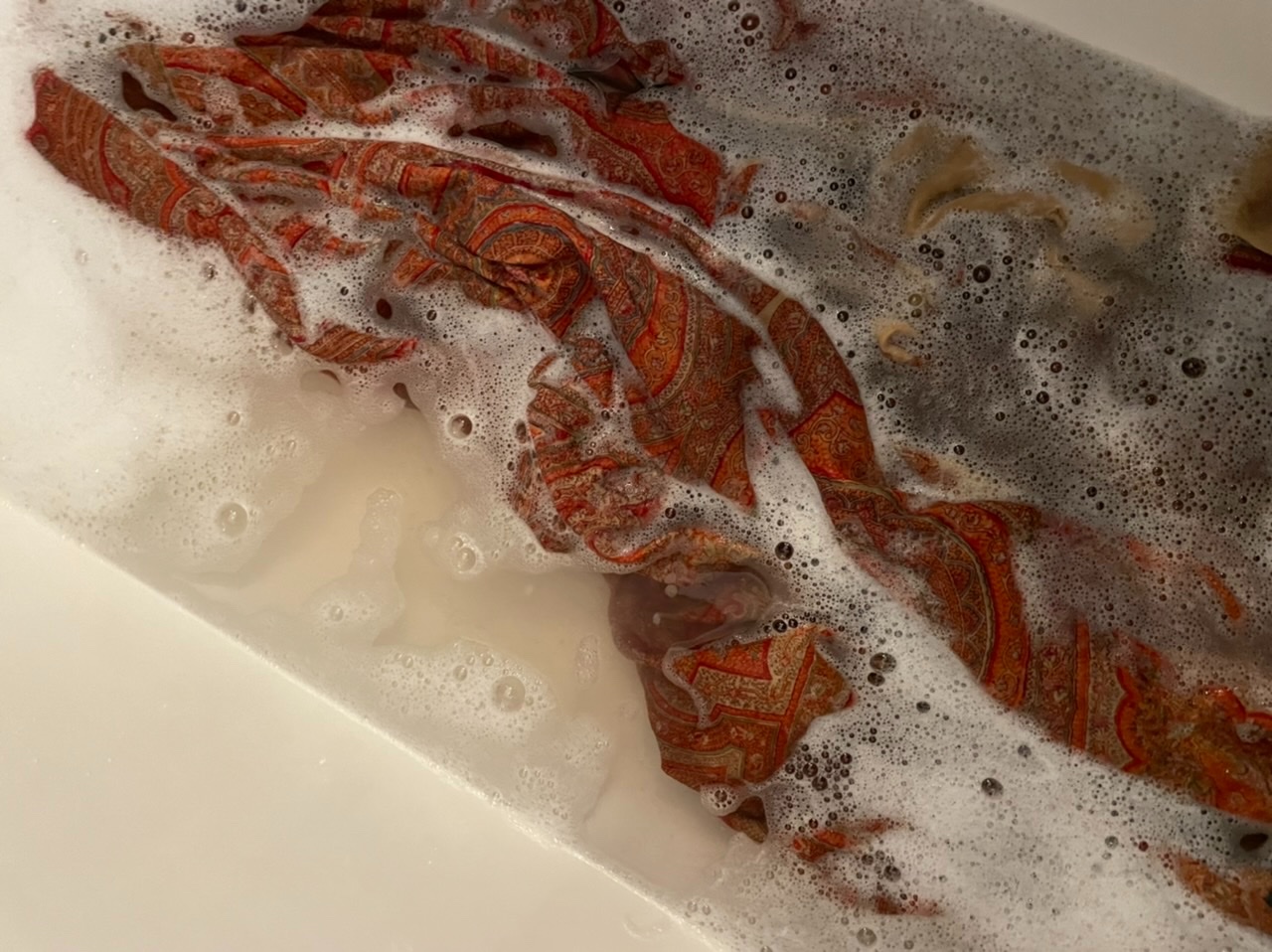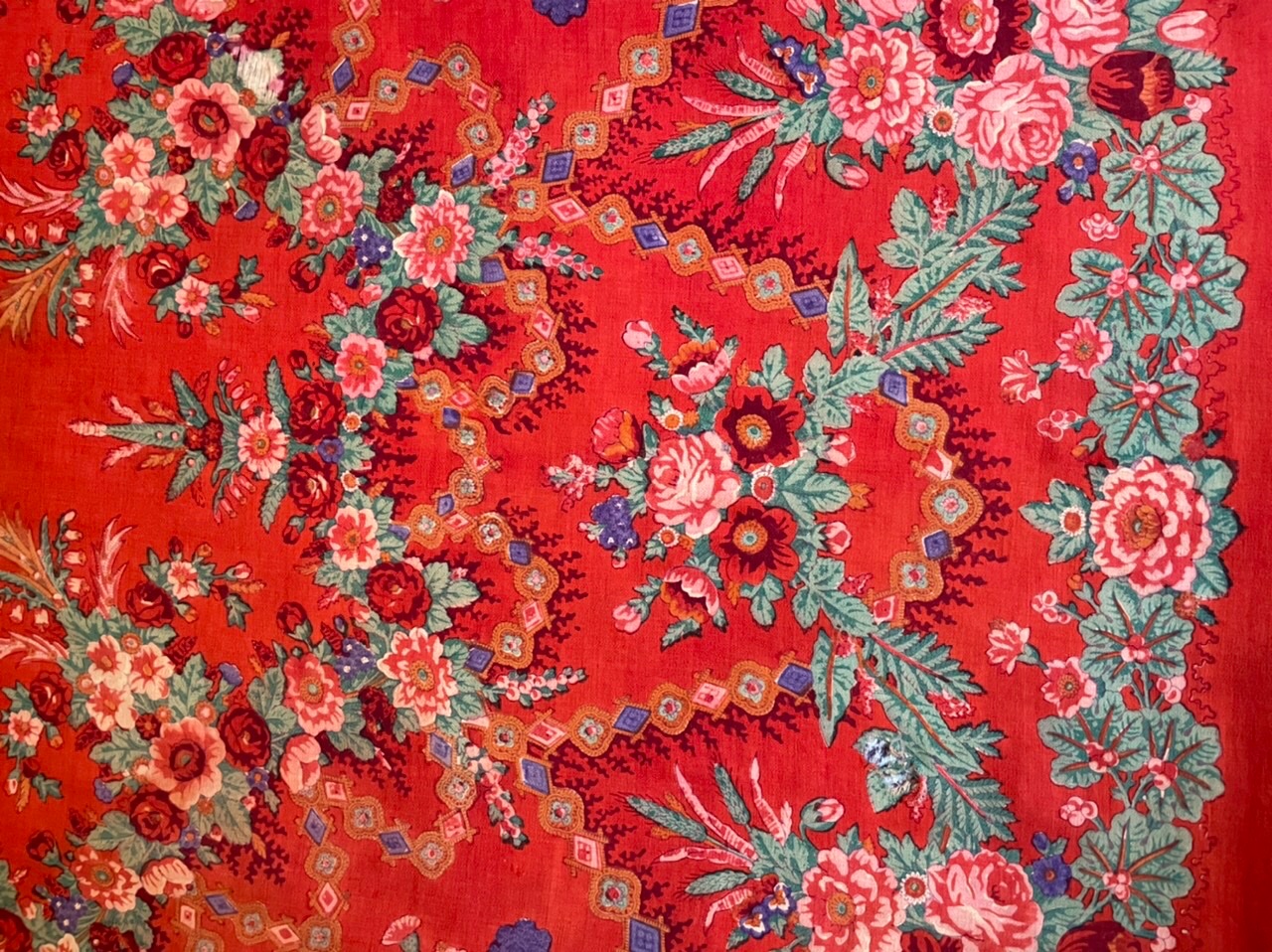 Старинная орнаментальная шаль второй половины 19 в., 178х178, ручная набойка, смесовая ткань (хлопчатобумажная основа, шерстяной уток), без бахромы. Клеймо «Фабрики братьев Штефко». Исходя из истории мануфактуры и клейма, период производства относится к промежутку 1862-1880 гг