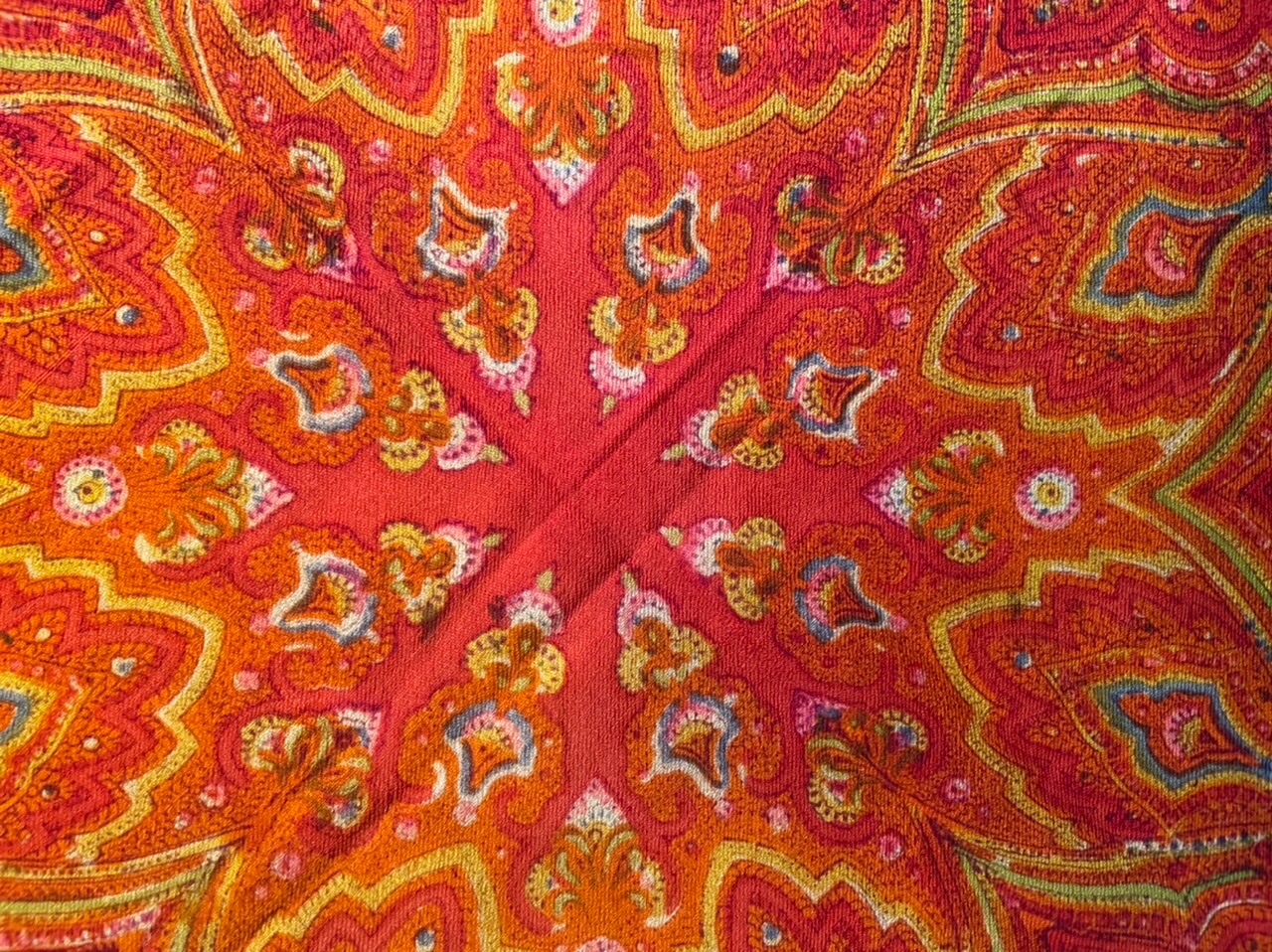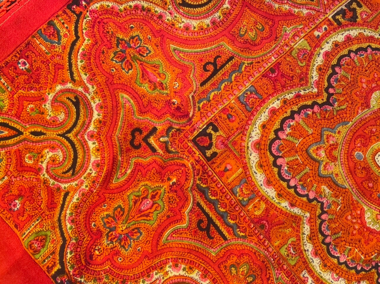 Старинная орнаментальная шаль, конец XIX — начало XX вв., 146 х 144. Тонкая шерсть, ручная набойка, шерстяная бахрома в две клетки без утрат. Автор неизвестен. Штамп «123».