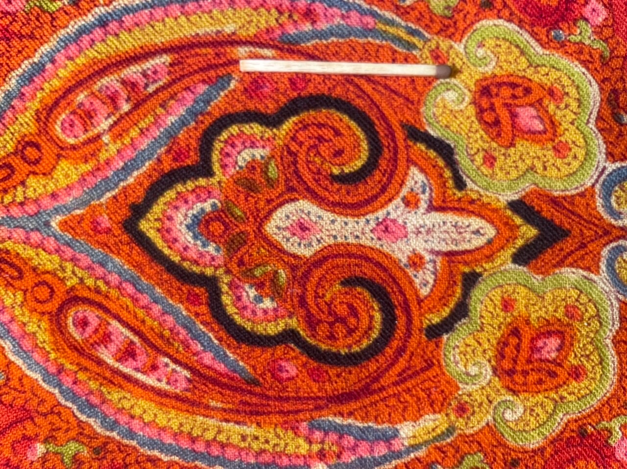 Оригинальный восточный рисунок выполнен в красно—оранжевой гамме, контуры набиты лиловым цветом. Небольшой звездчатый средник плотно заполнен элементами рисунка. Композиция выстроена в виде восьмиконечной фигуры с угловыми элементами в виде фестончатых «кокошников», в которых расположены парные элементы в виде сплетённых «восточных огурцов» с контурами чёрного и бирюзового цвета. Все фигуры филигранно заполнены мелким цветочным рисунком. Край шали оформлен богатой широкой каймой.