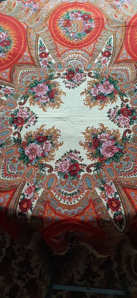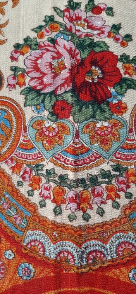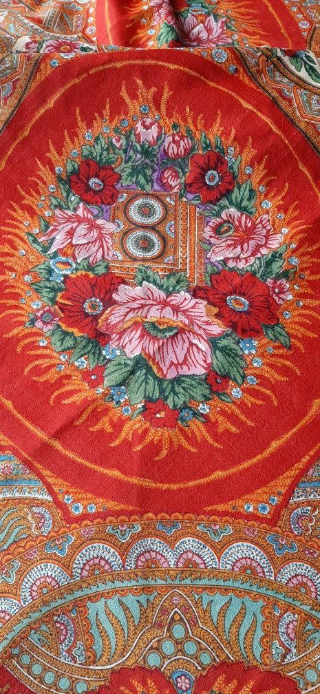 По информации продавца, платок хранился в семье и передавался по наследству от бабушки. Дословно:"он был подарен барином моей бабушке когда она была ещё ребёнком, у него была своя фабрика и красильня, это все было в Раменском районе Московской области, её родители у него работали. Платку 170 лет."