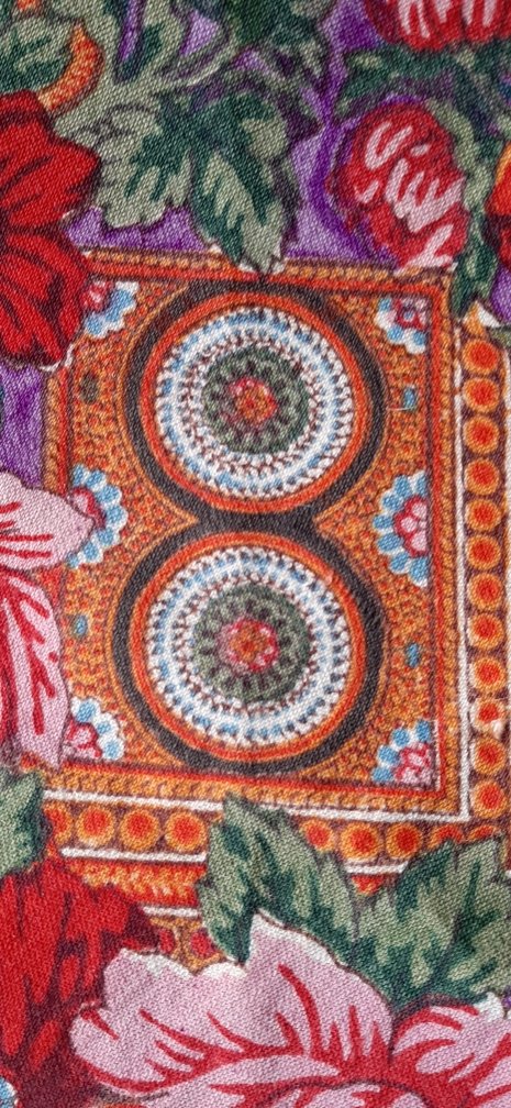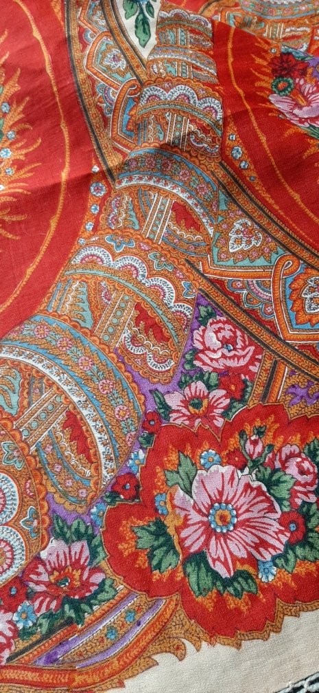Итак, платок ручной набойки на смесовой ткани (шерсть/хлопок). Размер по утку - 145 см, по основе - 153,5 см. Одинарная подгибка по утку ручным швом. По основе - кромка. Бахрома шерстяная, плетеная.