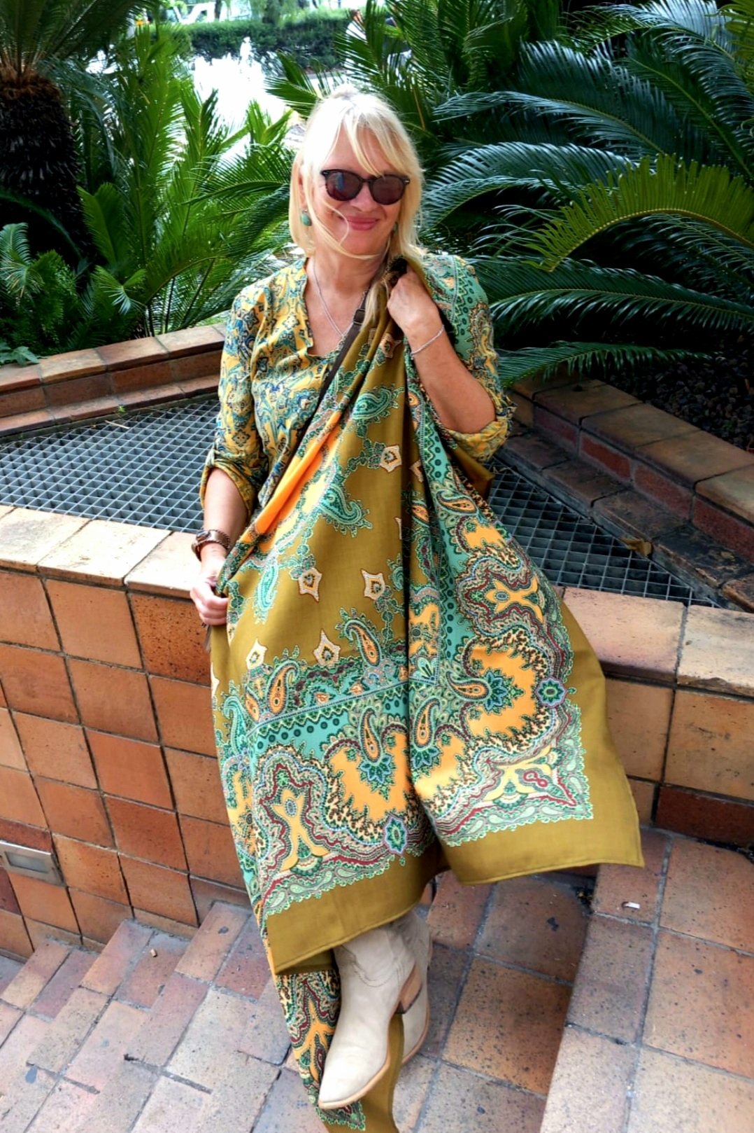 Елена,платок уникален,что подстраиваются под любой сезон,сейчас созвучен с опавшими листьями,голыми веточками,сухой травой!красивая осенняя прогулка!