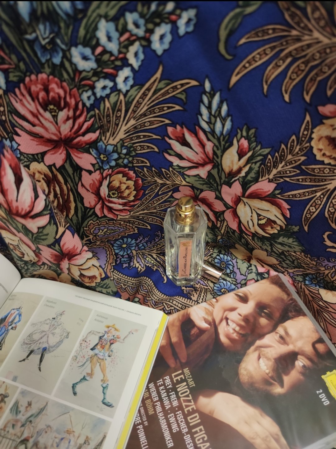 Как интересно! Этот запах мне неизвестен, но идею я поняла) Если идти за мыслью и колоритом шали, то да, очень понятен выбор искрящегося Моцарта. Но у меня немного другое ее восприятие, я вижу рисунок шали несколько колко-острым, с долей почти утрированной стилизации. И даже жестким, эти листья пальм - словно бронзовые накладки на ампирном декоре.. И совмещением несовместимого. Полукружья венков - опять же об ампире . И немного схематичные, простоватые, полевые цветы, почти на грани с сорняками.. И этот внутренняя противоречивость для меня не совпадает с Моцартом. Так и видится мне какая-то странная немного, с модернистским уклоном, постановка Евгения Онегина..не знаю,есть ли такая)
