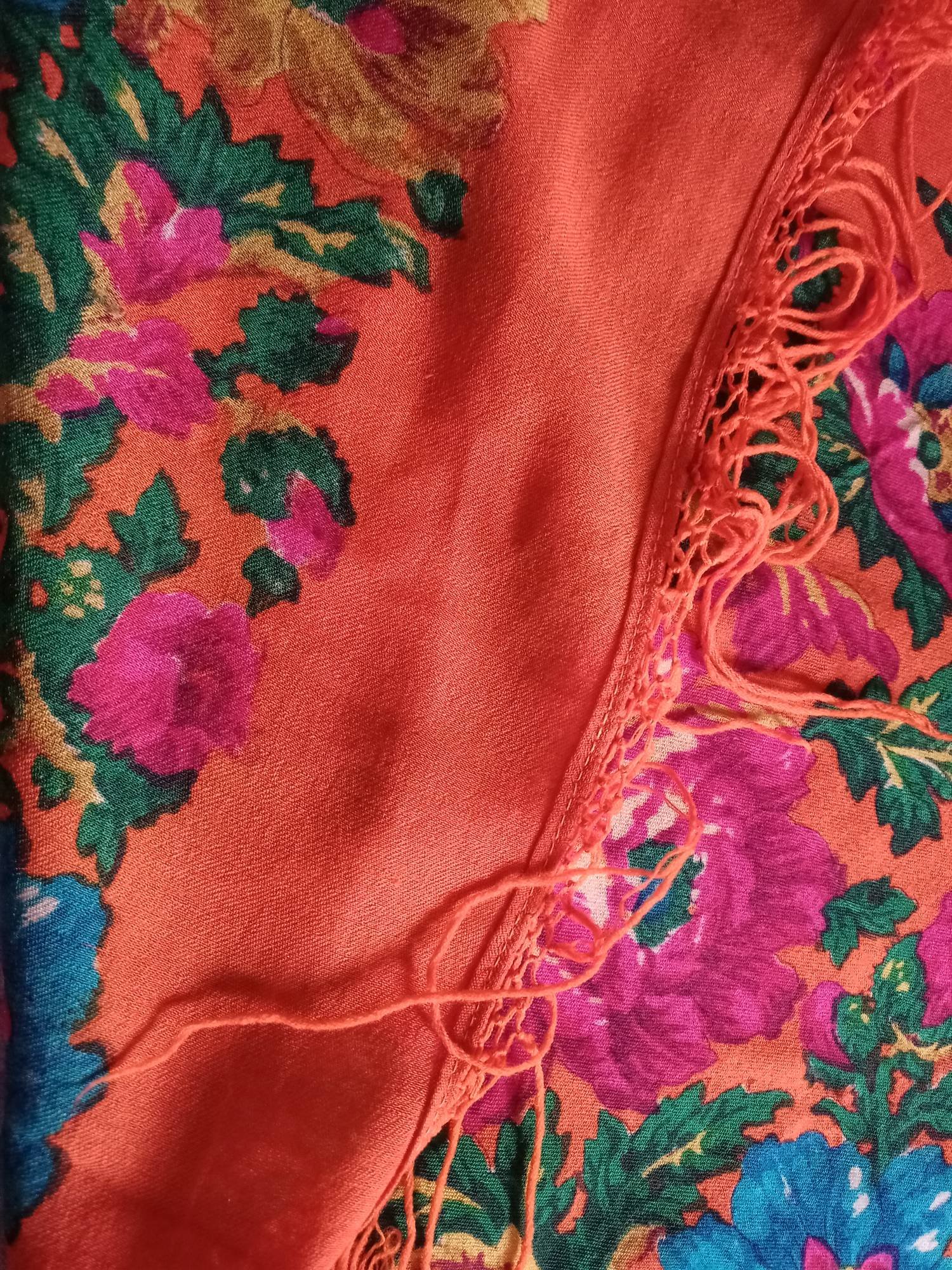 Шерсть тончайшая, тем более удивительна сохранность. И, как водится на платках 50х - 60х годов, отличные красители и яркость цвета с обеих сторон.