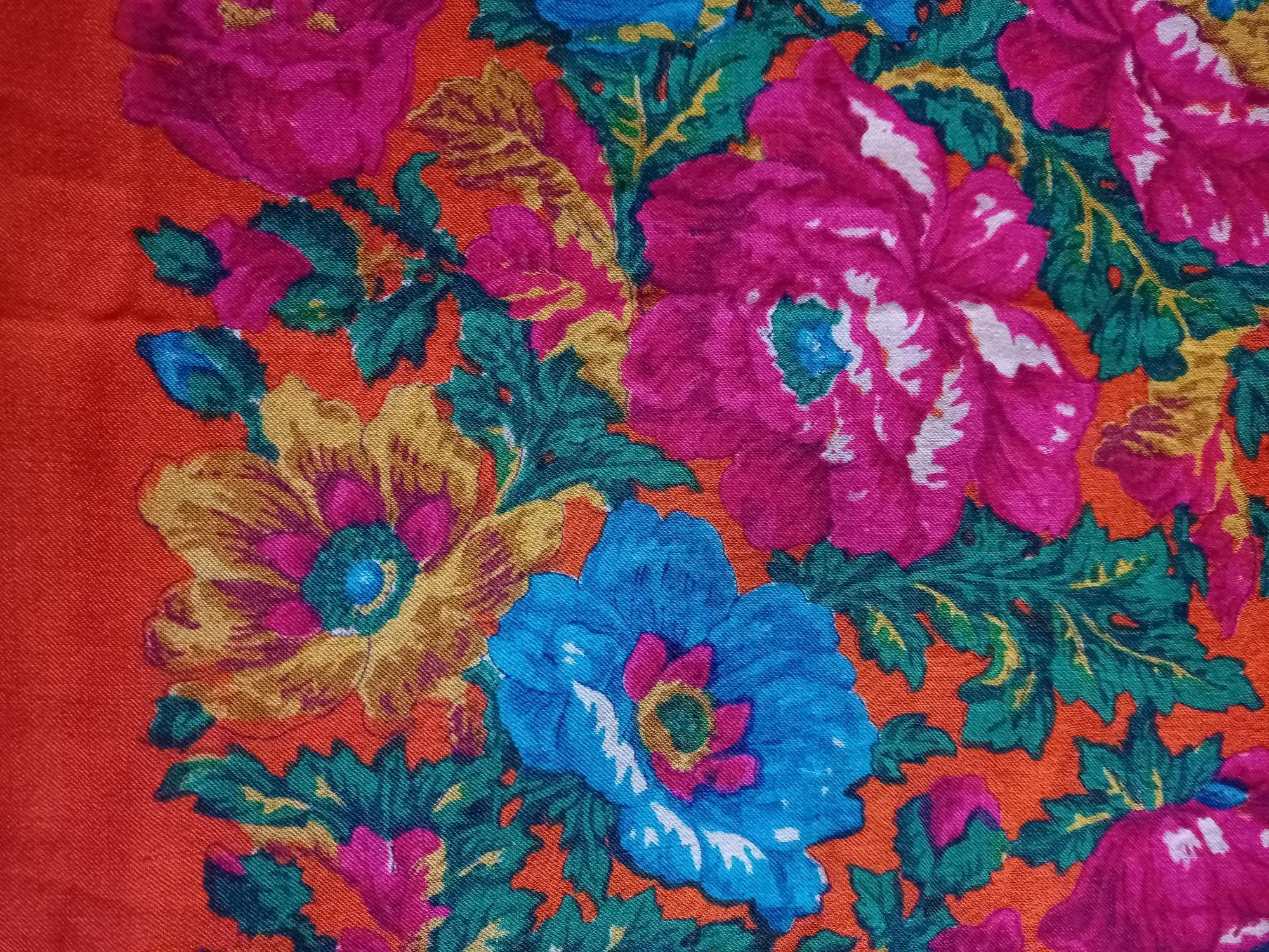 Платок размером 148х148 см, напечатан на тонкой шерстяной ткани. Двойная подгибка со всех сторон.