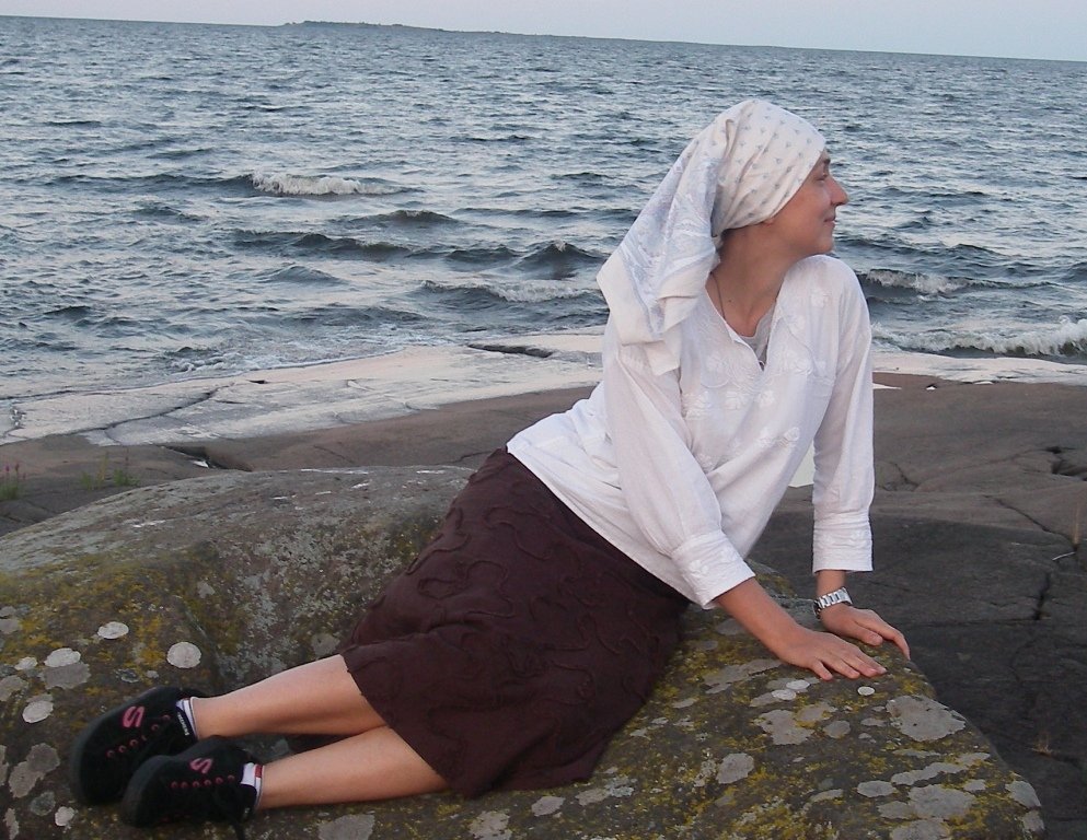 ALLA OK. платок по выработке с лицевой стороны в джинсовый рубчик, благодаря чему "как прибили, то есть завязали, так и держится", но действительно, нежный нежный по расцветке. Спасибо, что оценили образы. Валаамская природа такая, суровая, не яркая, но располагающая к долгим взглядам в даль. И помолчать. Необычное там место, конечно.