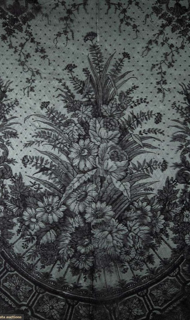 Попалась в ВК вот такая шаль - треугольная кружевная шаль из кружева шантильи и подкладкой из шёлкового крепа, начало 1850-х годов. Чем не букет Ностальгии
