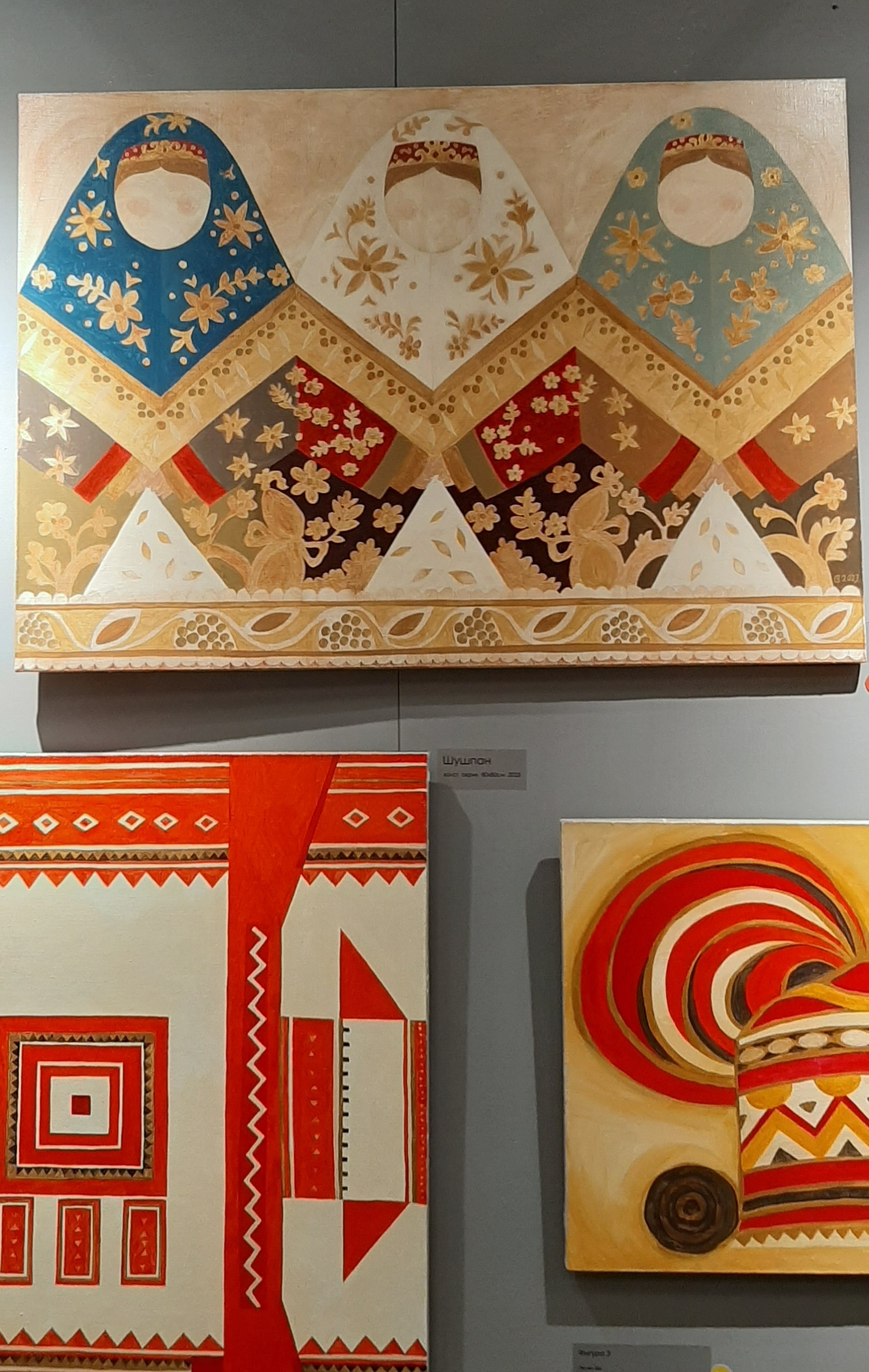 Была на выставке Арт Мир.(Кликните, чтобы почитать, что спрятано под катом)... Только на картине Дмитрия Рытяева присутствовала тема платка. А еще в одном павильоне то ли случайно, то ли специально на спинке стула висел павловопосадский платок
